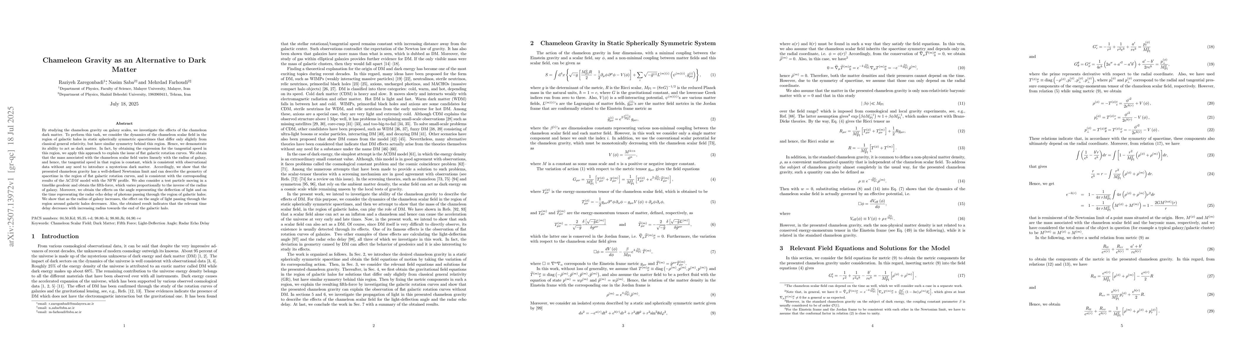 The research explores chameleon gravity as an alternative to dark matter, demonstrating its potential to explain flat galactic rotation curves without invoking dark matter. It shows that the chameleon scalar field's mass varies linearly with radius, maintaining constant tangential speed, consistent with observations. The study also reveals a fifth-force varying inversely with radius and effects on light deflection and photon delay, aligning with the ΛCDM model's predictions.
