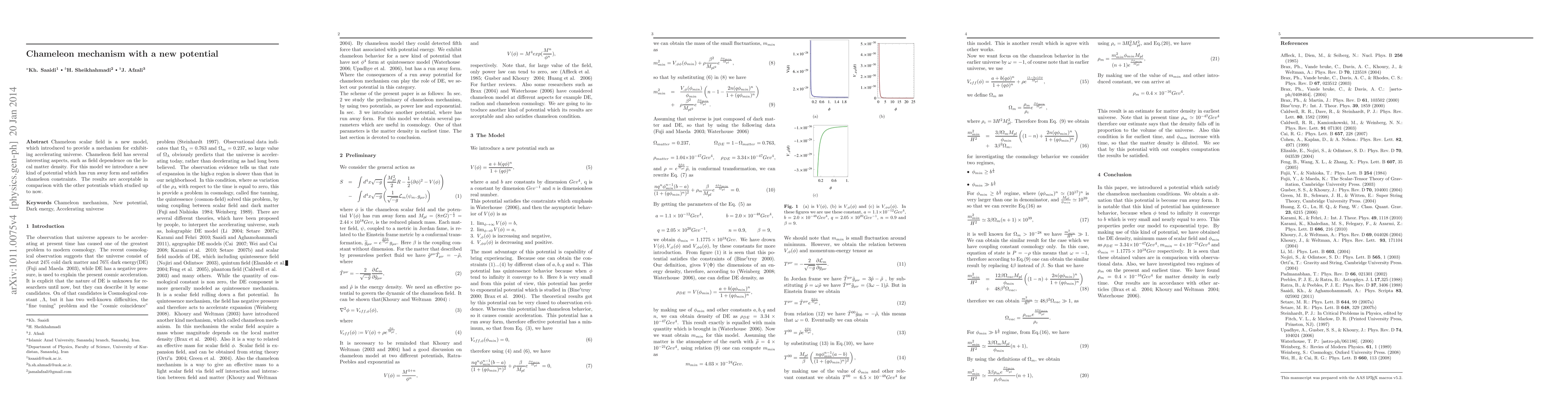 This paper proposes a new potential for the chameleon scalar field model, which depends on local matter density and aims to explain an accelerating universe. The introduced potential satisfies chameleon constraints and shows comparable results to previously studied potentials.