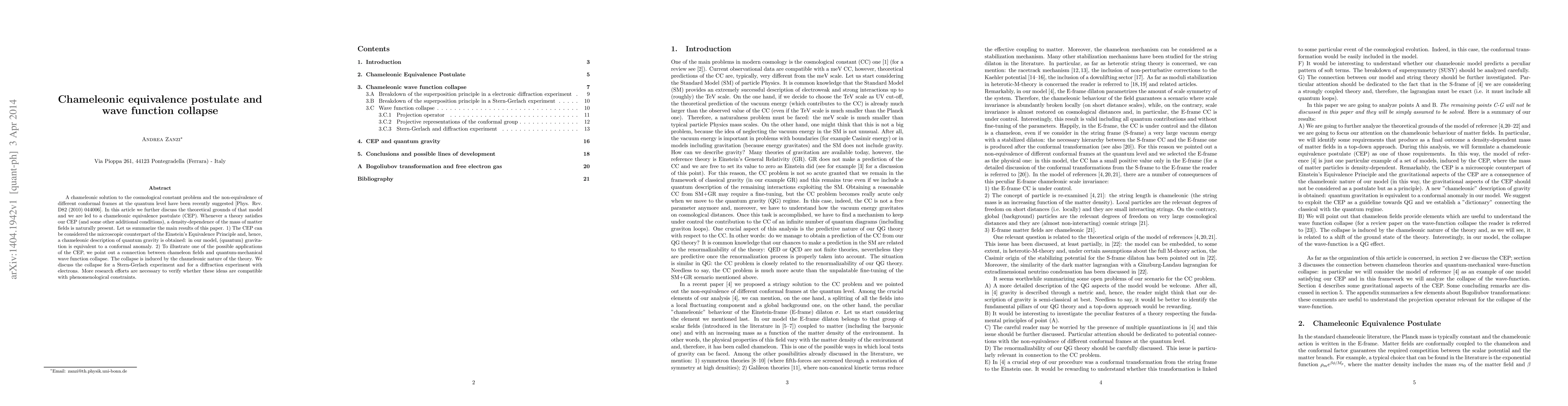 A chameleonic solution to the cosmological constant problem and the non-equivalence of different conformal frames at the quantum level have been recently suggested [Phys. Rev. D82 (2010) 044006]. In this article we further discuss the theoretical grounds of that model and we are led to a chameleonic equivalence postulate (CEP). Whenever a theory satisfies our CEP (and some other additional conditions), a density-dependence of the mass of matter fields is naturally present. Let us summarize the main results of this paper. 1) The CEP can be considered the microscopic counterpart of the Einstein's Equivalence Principle and, hence, a chameleonic description of quantum gravity is obtained: in our model, (quantum) gravitation is equivalent to a conformal anomaly. 2) To illustrate one of the possible applications of the CEP, we point out a connection between chameleon fields and quantum-mechanical wave function collapse. The collapse is induced by the chameleonic nature of the theory. We discuss the collapse for a Stern-Gerlach experiment and for a diffraction experiment with electrons. More research efforts are necessary to verify whether these ideas are compatible with phenomenological constraints.