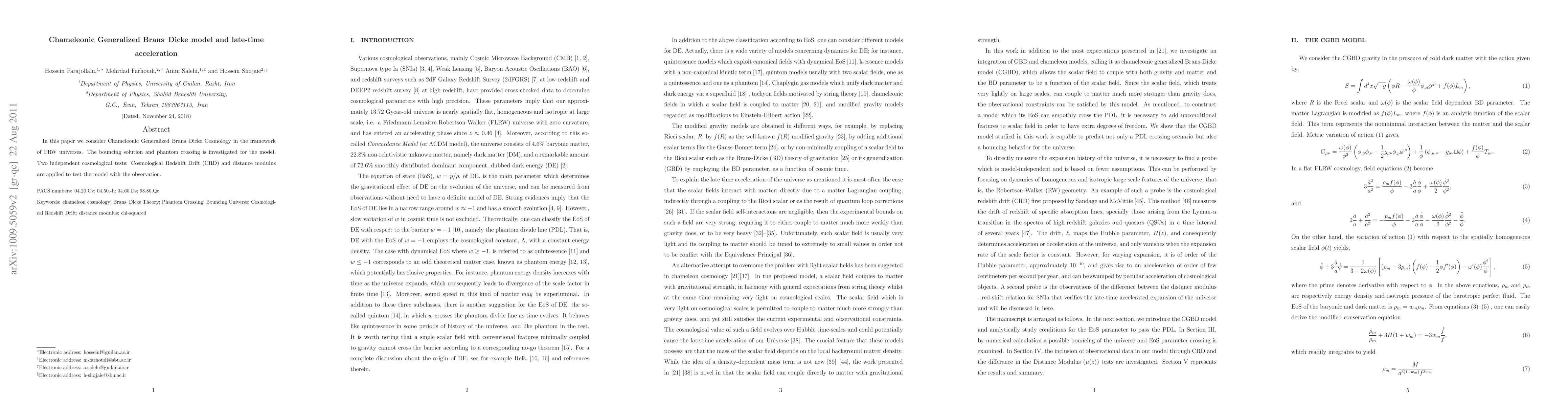 This paper explores Chameleonic Generalized Brans--Dicke Cosmology in FRW universes, investigating bouncing solutions and phantom crossing, and tests the model using Cosmological Redshift Drift and distance modulus observations. The study aims to understand late-time acceleration in the universe.
