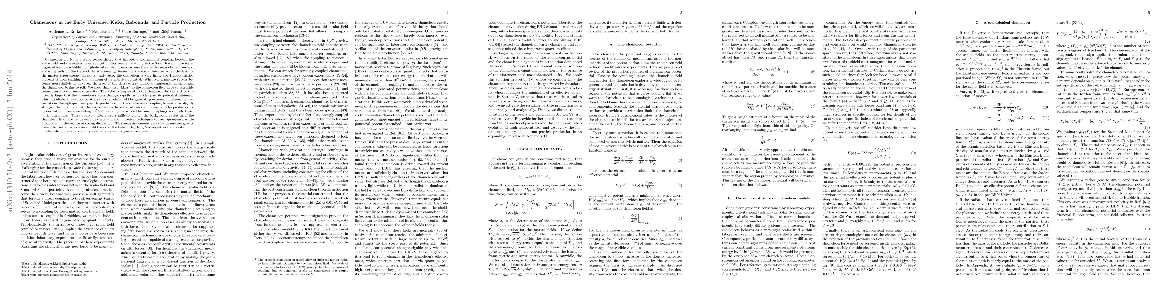 Chameleon gravity is a scalar-tensor theory that includes a non-minimal coupling between the scalar field and the matter fields and yet mimics general relativity in the Solar System. The scalar degree of freedom is hidden in high-density environments because the effective mass of the chameleon scalar depends on the trace of the stress-energy tensor. In the early Universe, when the trace of the matter stress-energy tensor is nearly zero, the chameleon is very light, and Hubble friction prevents it from reaching the minimum of its effective potential. Whenever a particle species becomes non-relativistic, however, the trace of the stress-energy tensor is temporarily nonzero, and the chameleon begins to roll. We show that these "kicks" to the chameleon field have catastrophic consequences for chameleon gravity. The velocity imparted to the chameleon by the kick is sufficiently large that the chameleon's mass changes rapidly as it slides past its potential minimum. This nonadiabatic evolution shatters the chameleon field by generating extremely high-energy perturbations through quantum particle production. If the chameleon's coupling to matter is slightly stronger than gravitational, the excited modes have trans-Planckian momenta. The production of modes with momenta exceeding 1e7 GeV can only be avoided for small couplings and finely tuned initial conditions. These quantum effects also significantly alter the background evolution of the chameleon field, and we develop new analytic and numerical techniques to treat quantum particle production in the regime of strong dissipation. This analysis demonstrates that chameleon gravity cannot be treated as a classical field theory at the time of Big Bang Nucleosynthesis and casts doubt on chameleon gravity's viability as an alternative to general relativity.