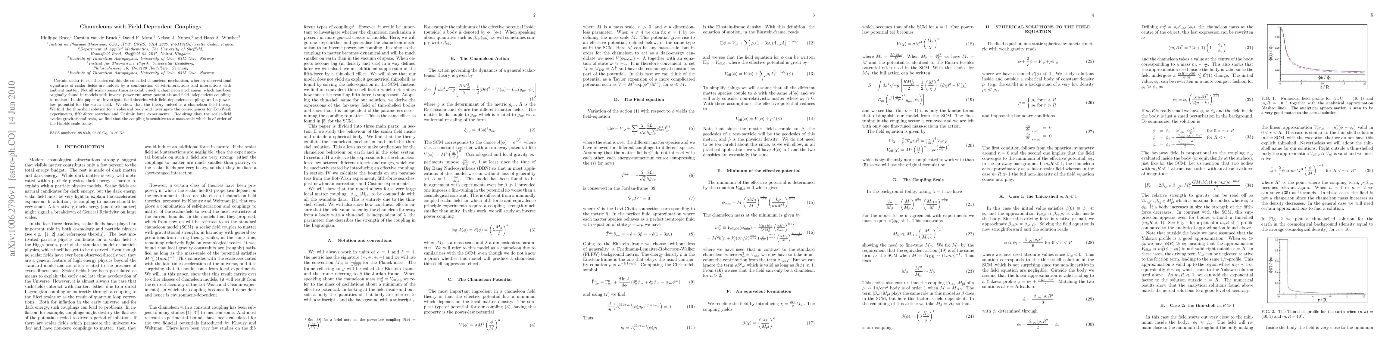 Certain scalar-tensor theories exhibit the so-called chameleon mechanism, whereby observational signatures of scalar fields are hidden by a combination of self-interactions and interactions with ambient matter. Not all scalar-tensor theories exhibit such a chameleon mechanism, which has been originally found in models with inverse power run-away potentials and field independent couplings to matter. In this paper we investigate field-theories with field-dependent couplings and a power-law potential for the scalar field. We show that the theory indeed is a chameleon field theory. We find the thin-shell solution for a spherical body and investigate the consequences for E\"ot-Wash experiments, fifth-force searches and Casimir force experiments. Requiring that the scalar-field evades gravitational tests, we find that the coupling is sensitive to a mass-scale which is of order of the Hubble scale today.
