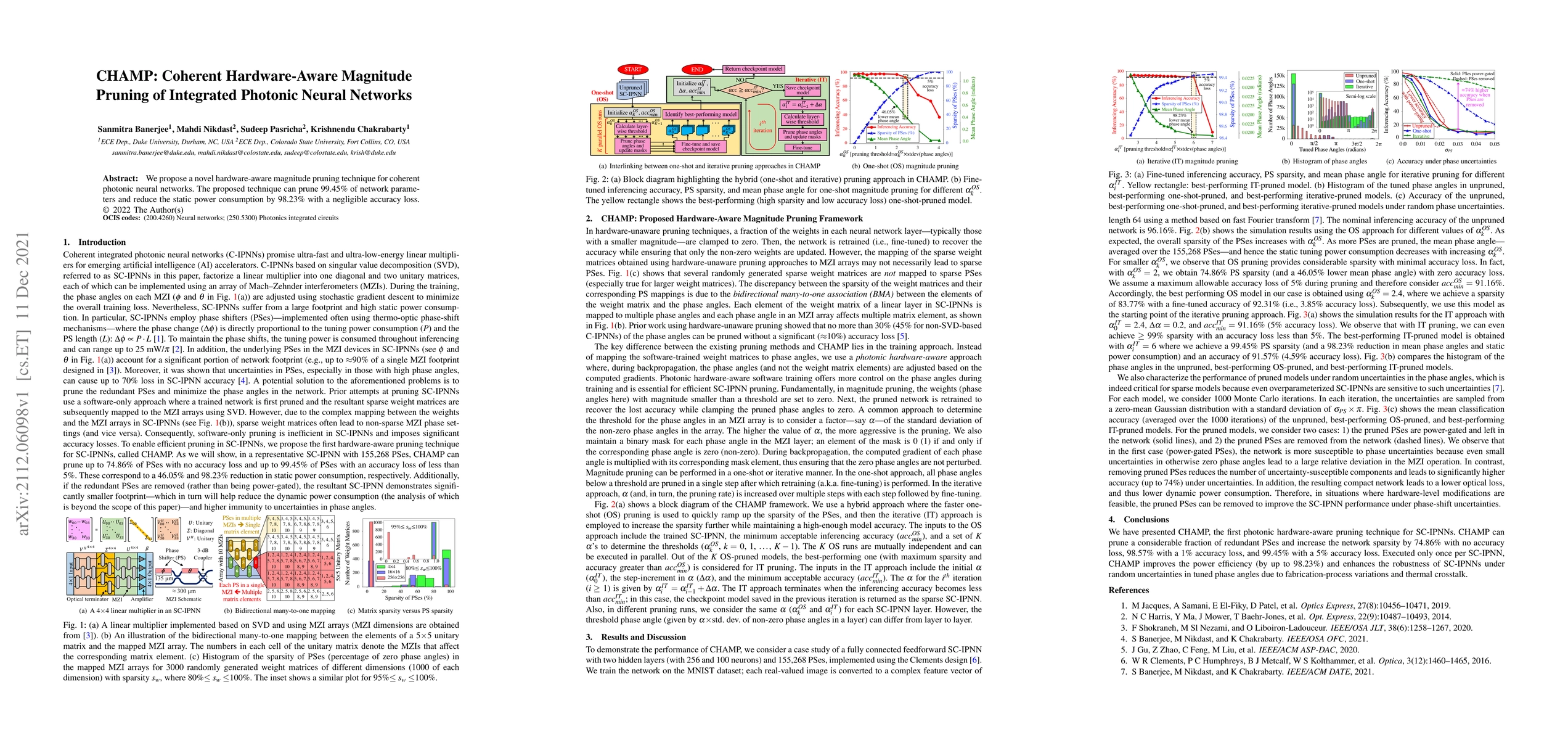 Summary: CHAMP introduces a hardware-aware magnitude pruning method for photonic neural networks, achieving 99.45% parameter reduction and 98.23% power consumption decrease while maintaining minimal accuracy loss.