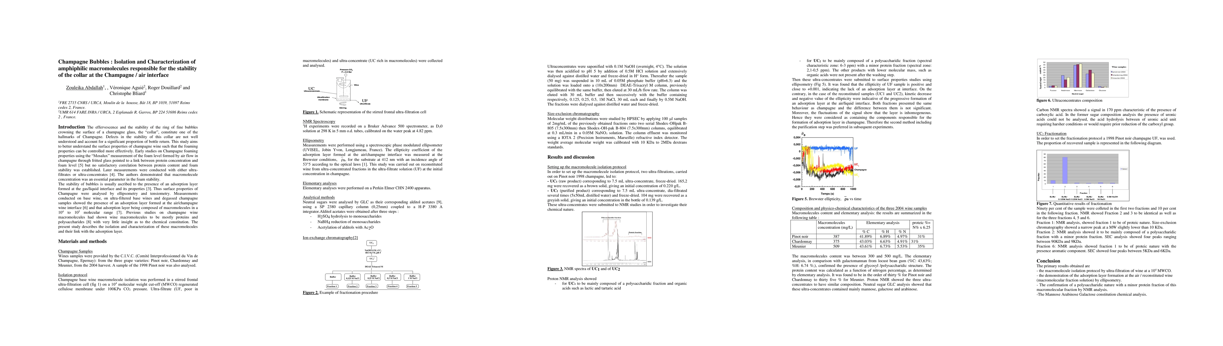 The effervescence and the stability of the ring of fine bubbles crowning the surface of a champagne glass, the "collar", constitute one of the hallmarks of Champagne. Defects in the stability of this collar are not well understood and account for a significant proportion of bottle return. This study aims to better understand the surface properties of champagne wine such that the foaming properties can be controlled more effectively. Early studies on Champagne foaming properties using the "Mosalux" measurement of the foam level formed by air flow in champagne through fritted glass pointed to a link between protein concentration and foam level [5] but no satisfactory correlation between protein content and foam stability was established. Later measurements were conducted with either ultra-filtrates or ultra-concentrates [4]. The authors demonstrated that macromolecule concentration was an essential parameter in the foam stability. The stability of bubbles is usually ascribed to the presence of an adsorption layer formed at the gas/liquid interface and its properties [3]. Thus surface properties of Champagne were analysed by ellipsometry and tensiometry. Measurements conducted on base wine, on ultra-filtered base wines and degassed champagne samples showed the presence of an adsorption layer formed at the air/champagne wine interface [6] and that adsorption layer being composed of macromolecules in a 104 to 105 molecular range [7]. Previous studies on champagne wine macromolecules had shown wine macromolecules to be mostly proteins and polysaccharides [8] with very little insight as to the chemical constitution. The present study describes the isolation and characterization of these macromolecules and their link with the adsorption layer.