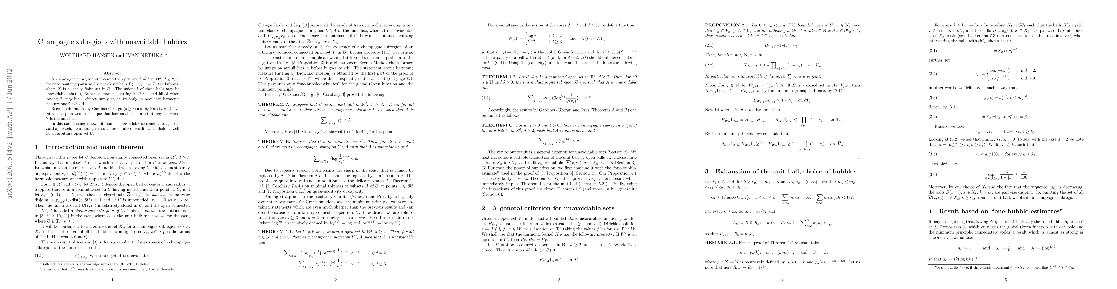 A champagne subregion of a connected open set $U\ne\emptyset$ in $R^d$, $d\ge 2$, is obtained omitting pairwise disjoint closed balls $\bar B(x, r_x)$, $x\in X$, the bubbles, where $X$ is a locally finite set in $U$. The union $A$ of these balls may be unavoidable, that is, Brownian motion, starting in $U\setminus A$ and killed when leaving $U$, may hit $A$ almost surely or, equivalently, $A$ may have harmonic measure one for $U\setminus A$. Recent publications by Gardiner/Ghergu ($d\ge 3$) and by Pres ($d=2$) give rather sharp answers to the question how small such a set $A$ may be, when $U$ is the unit ball. In this paper, using a new criterion for unavoidable sets and a straightforward approach, much stronger results are obtained, results which hold as well for an arbitrary open set $U$.