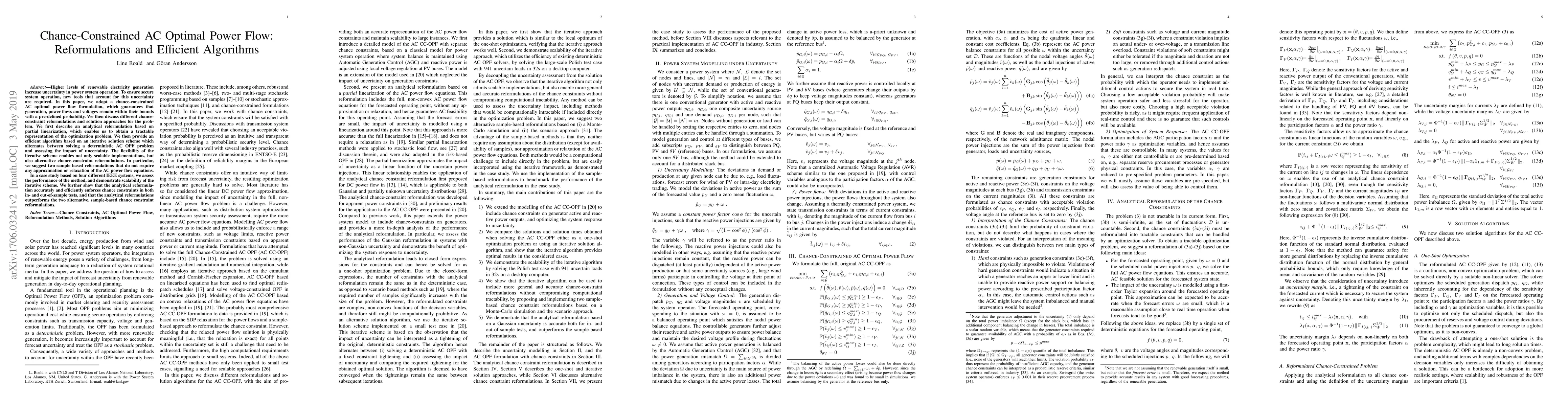 Higher levels of renewable electricity generation increase uncertainty in power system operation. To ensure secure system operation, new tools that account for this uncertainty are required. In this paper, we formulate a chance-constrained AC optimal power flow problem, which guarantees that generation, power flows and voltages remain within their bounds with a pre-defined probability. We then propose an accurate, yet tractable analytical reformulation of the chance constraints. The reformulation maintains the full, non-linear AC power flow equations for the forecasted operating point, and models the impact of uncertainty through a linearization around this point. We discuss different solution algorithms, including one-shot optimization with and without recourse, and an iterative algorithm which enables scalable implementations. We further discuss how more general chance constraint reformulations can be incorporated within the iterative solution algorithm. In a case study based on four different IEEE systems, we compare the performance of the solution algorithms, and demonstrate scalability of the iterative scheme. We further show that the analytical reformulation accurately and efficiently enforces chance constraints in both in- and out-of-sample tests, and that the analytical approach outperforms two alternative, sample based chance constraint reformulations.