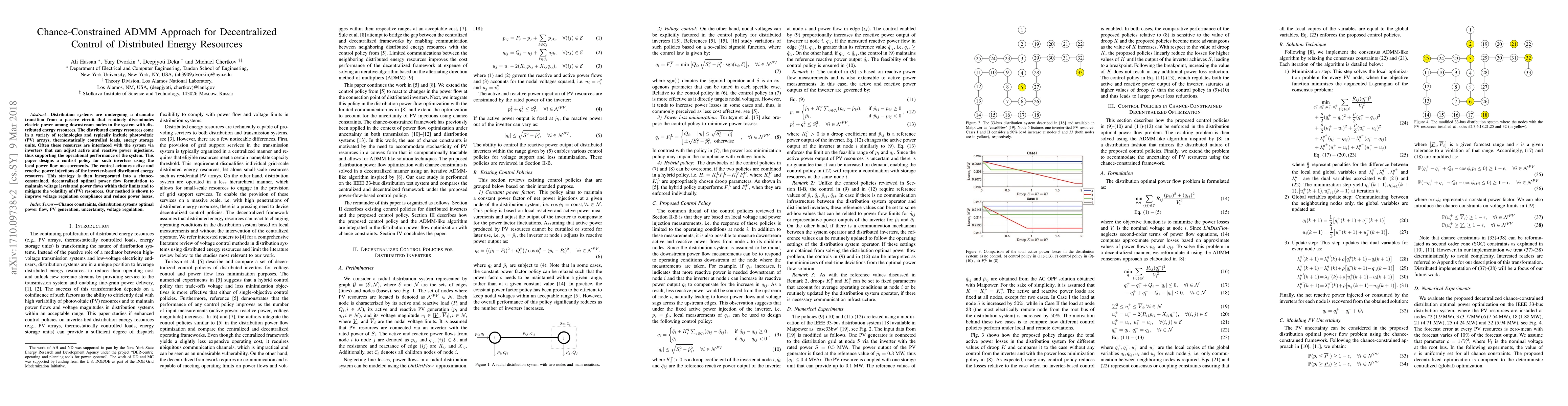 This paper proposes a decentralized control policy for inverter-based distributed energy resources using a chance-constrained ADMM approach. The strategy aims to maintain voltage levels and power flows within limits while mitigating the volatility of photovoltaic resources through optimal power flow.