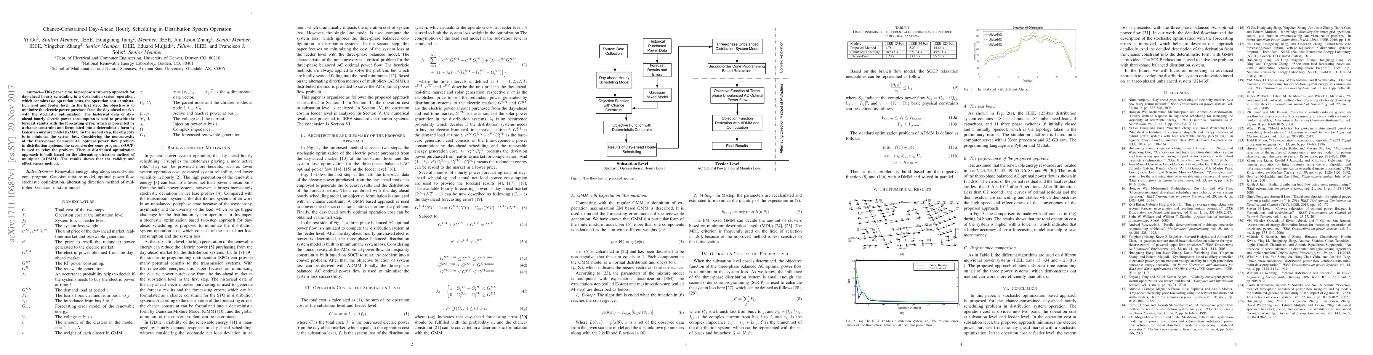 This paper proposes a two-step method for day-ahead hourly scheduling in distribution system operation, minimizing substation and feeder operation costs using stochastic optimization and a Gaussian mixture model. A second-order cone program is applied to address the nonconvexity of the optimal power flow problem, followed by a distributed optimization approach using ADMM.
