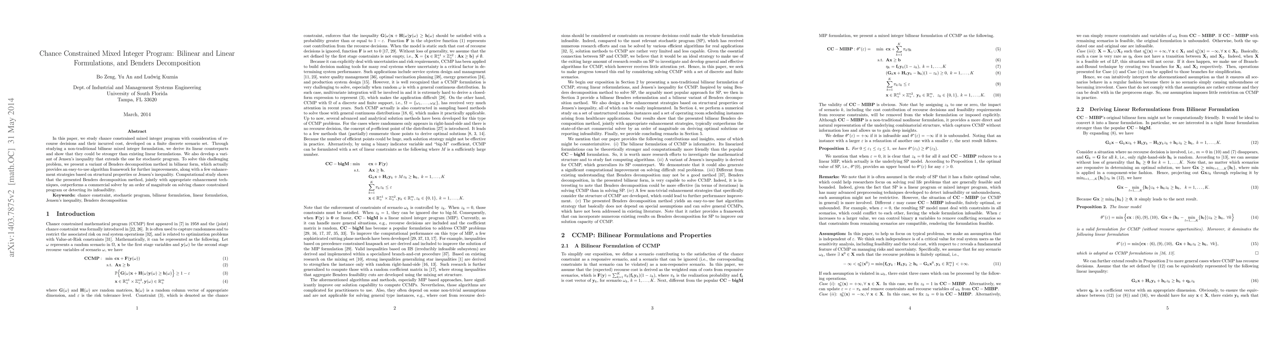 This paper investigates chance constrained mixed integer programs with recourse decisions, proposing bilinear and linear formulations. It introduces a novel Benders decomposition method for solving these problems, demonstrating its effectiveness through computational studies that outperform commercial solvers.