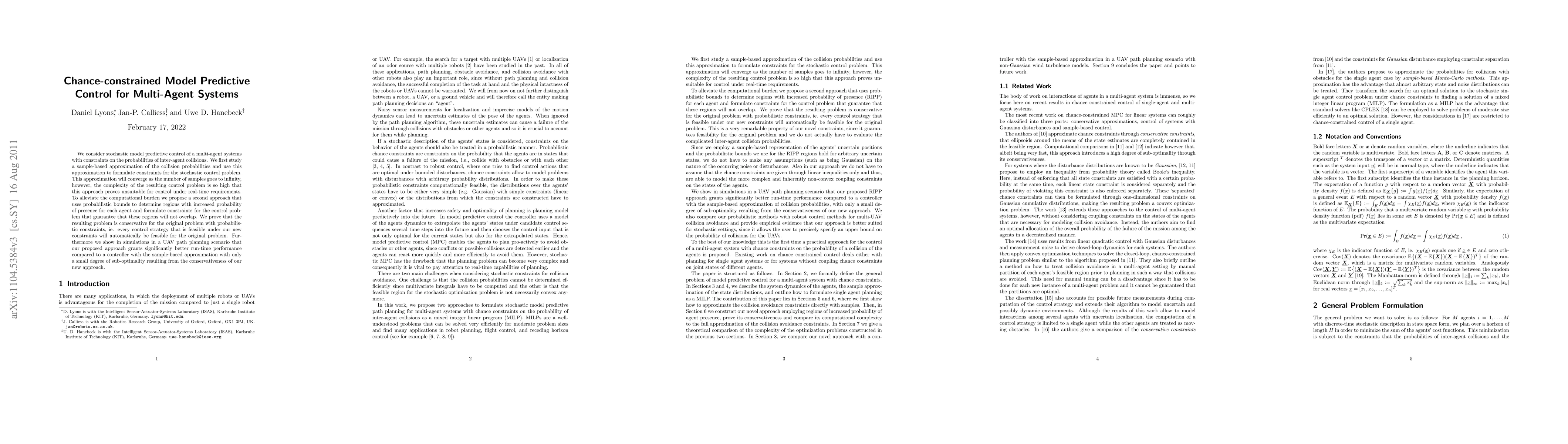 This research paper proposes a method to control multi-agent systems under probabilistic constraints, reducing computational burden while maintaining feasibility, resulting in faster runtime performance.
