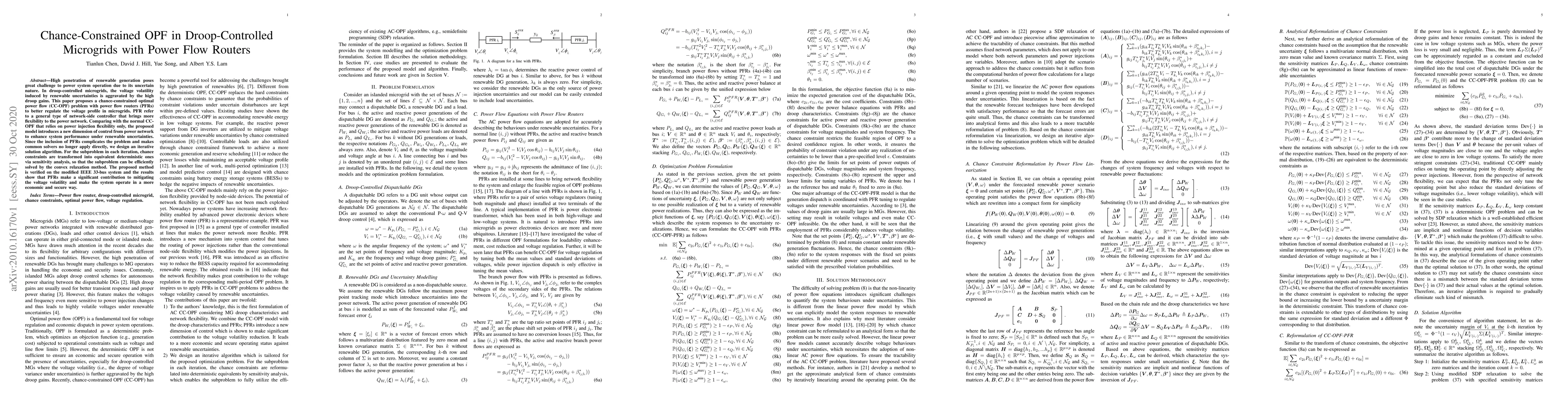 This paper proposes a chance-constrained optimal power flow (CC-OPF) model with power flow routers to regulate voltage profiles in droop-controlled microgrids affected by renewable generation uncertainties. An iterative solution algorithm is developed to handle the complexity introduced by PFRs, transforming chance constraints into deterministic equivalents for efficient convex relaxation.