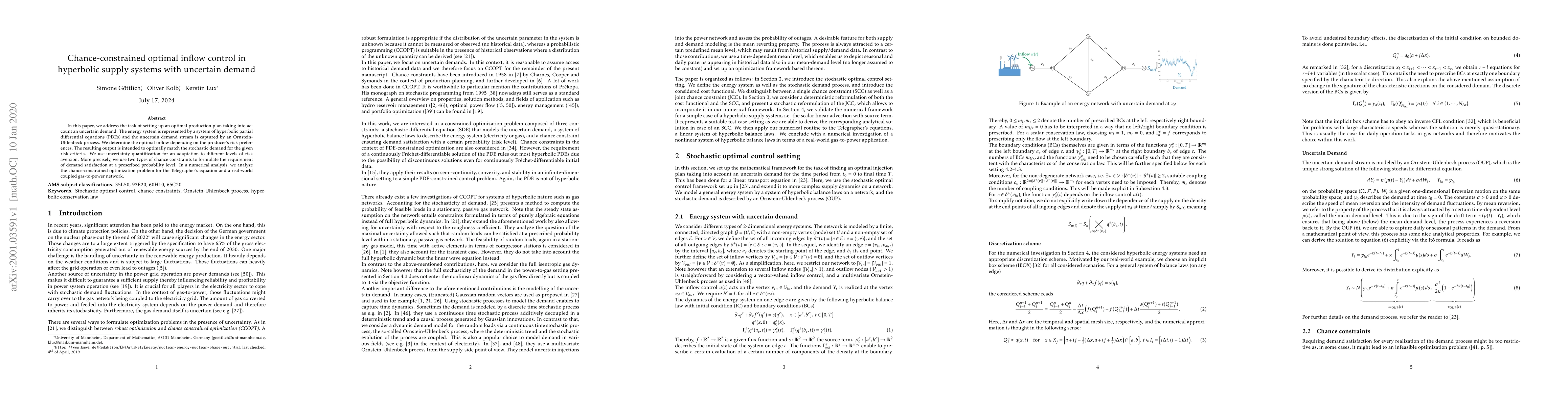 In this paper, we address the task of setting up an optimal production plan taking into account an uncertain demand. The energy system is represented by a system of hyperbolic partial differential equations (PDEs) and the uncertain demand stream is captured by an Ornstein-Uhlenbeck process. We determine the optimal inflow depending on the producer's risk preferences. The resulting output is intended to optimally match the stochastic demand for the given risk criteria. We use uncertainty quantification for an adaptation to different levels of risk aversion. More precisely, we use two types of chance constraints to formulate the requirement of demand satisfaction at a prescribed probability level. In a numerical analysis, we analyze the chance-constrained optimization problem for the Telegrapher's equation and a real-world coupled gas-to-power network.