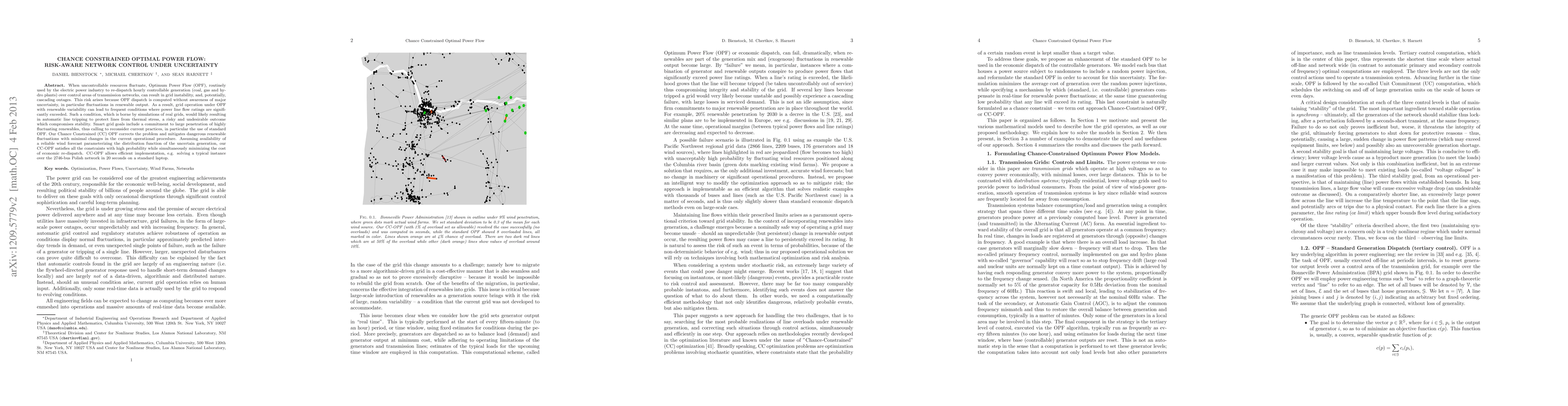 When uncontrollable resources fluctuate, Optimum Power Flow (OPF), routinely used by the electric power industry to re-dispatch hourly controllable generation (coal, gas and hydro plants) over control areas of transmission networks, can result in grid instability, and, potentially, cascading outages. This risk arises because OPF dispatch is computed without awareness of major uncertainty, in particular fluctuations in renewable output. As a result, grid operation under OPF with renewable variability can lead to frequent conditions where power line flow ratings are significantly exceeded. Such a condition, which is borne by simulations of real grids, would likely resulting in automatic line tripping to protect lines from thermal stress, a risky and undesirable outcome which compromises stability. Smart grid goals include a commitment to large penetration of highly fluctuating renewables, thus calling to reconsider current practices, in particular the use of standard OPF. Our Chance Constrained (CC) OPF corrects the problem and mitigates dangerous renewable fluctuations with minimal changes in the current operational procedure. Assuming availability of a reliable wind forecast parameterizing the distribution function of the uncertain generation, our CC-OPF satisfies all the constraints with high probability while simultaneously minimizing the cost of economic re-dispatch. CC-OPF allows efficient implementation, e.g. solving a typical instance over the 2746-bus Polish network in 20 seconds on a standard laptop.