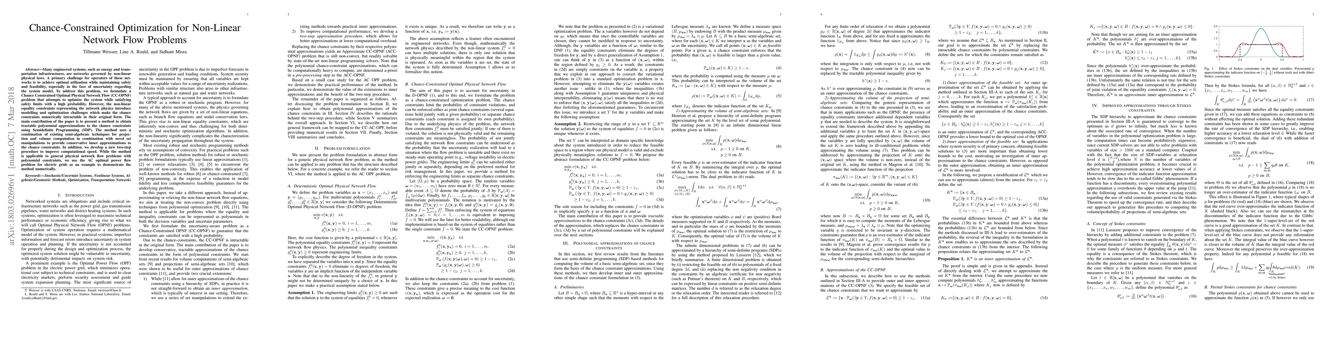 Many engineered systems, such as energy and transportation infrastructures, are networks governed by non-linear physical laws. A primary challenge for operators of these networks is to achieve optimal utilization while maintaining safety and feasibility, especially in the face of uncertainty regarding the system model. To address this problem, we formulate a Chance Constrained Optimal Physical Network Flow (CC-OPNF) problem that attempts to optimize the system while satisfying safety limits with a high probability. However, the non-linear equality constraints representing the network physics introduce modelling and optimization challenges which make the chance constraints numerically intractable in their original form. The main contribution of the paper is to present a method to obtain tractable polynomial approximations to the chance constraints using Semidefinite Programming (SDP). The method uses a combination of existing semi-algebraic techniques for projection and volume computation in combination with novel set manipulations to provide conservative inner approximations to the chance constraints. In addition, we develop a new two-step procedure to improve computational speed. While the method is applicable to general physical network flow problems with polynomial constraints, we use the AC optimal power flow problem for electric grids as an example to demonstrate the method numerically.