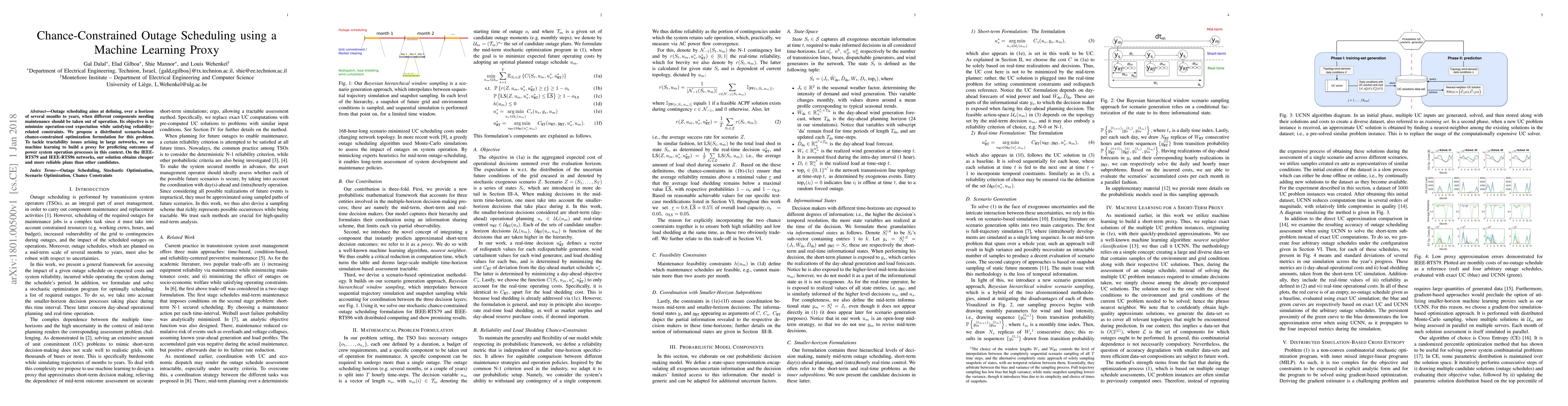 Outage scheduling aims at defining, over a horizon of several months to years, when different components needing maintenance should be taken out of operation. Its objective is to minimize operation-cost expectation while satisfying reliability-related constraints. We propose a distributed scenario-based chance-constrained optimization formulation for this problem. To tackle tractability issues arising in large networks, we use machine learning to build a proxy for predicting outcomes of power system operation processes in this context. On the IEEE-RTS79 and IEEE-RTS96 networks, our solution obtains cheaper and more reliable plans than other candidates.