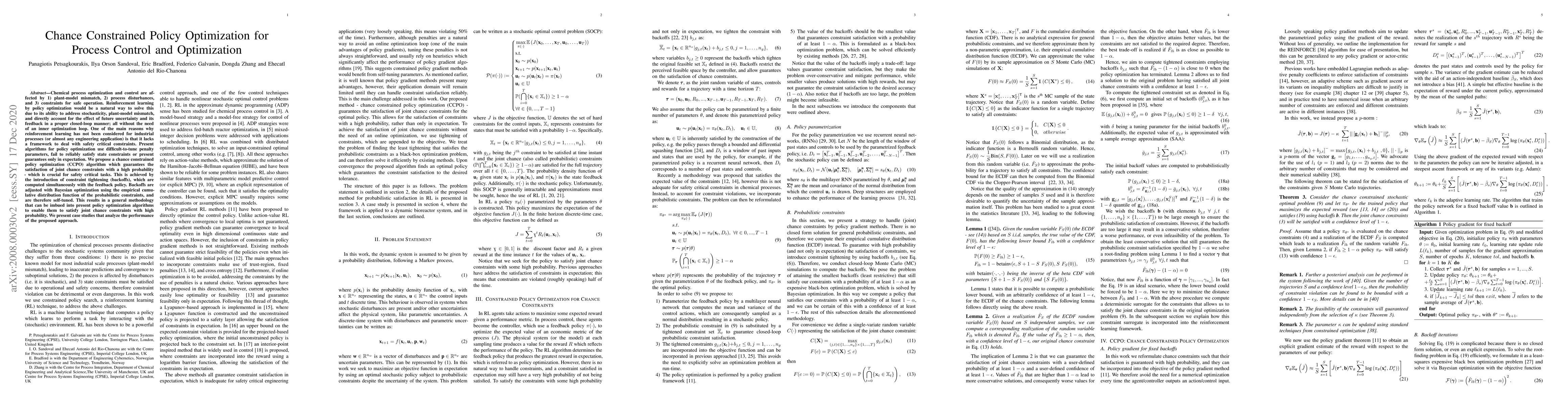 The paper proposes a chance constrained policy optimization (CCPO) algorithm to address safety critical constraints in reinforcement learning for chemical process control, ensuring high-probability satisfaction of joint probabilistic constraints through adaptive constraint tightening. Case studies demonstrate the effectiveness of CCPO in industrial applications.