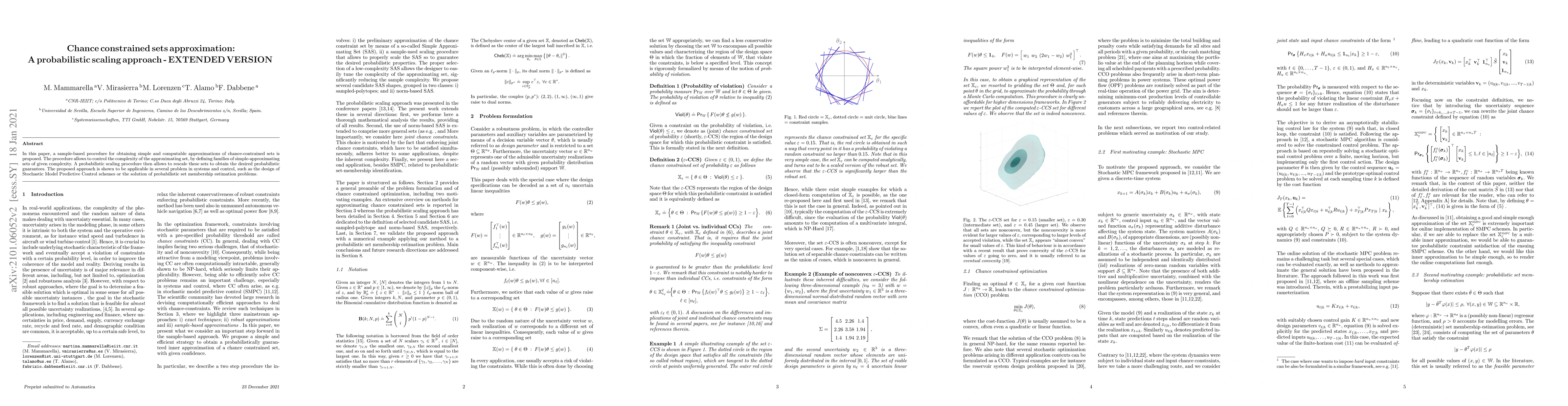 This paper proposes a sample-based method for approximating chance-constrained sets with controllable complexity, utilizing a probabilistic scaling approach to achieve desired probabilistic guarantees. The method is applicable to systems and control problems, including stochastic model predictive control and probabilistic set membership estimation.