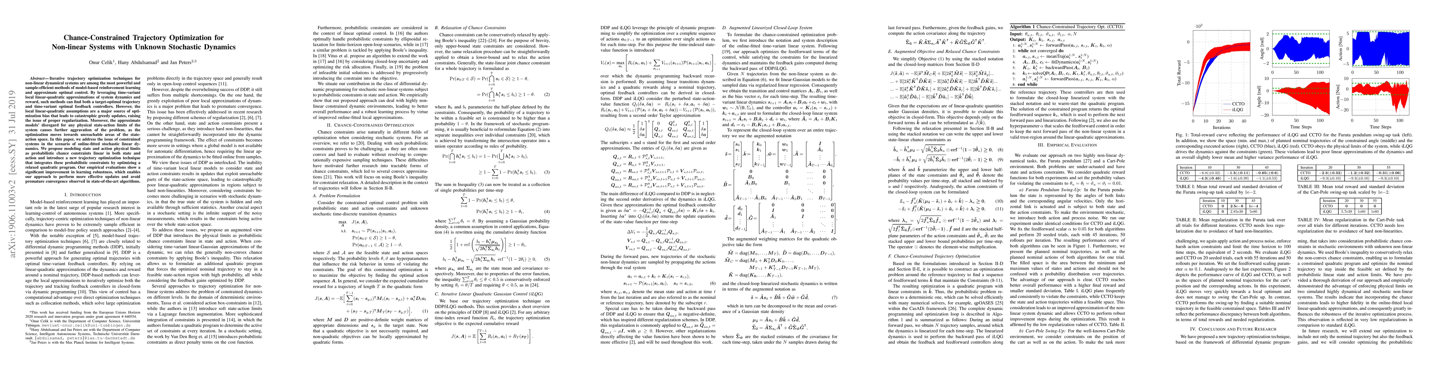 This paper proposes a chance-constrained trajectory optimization method for non-linear systems with unknown stochastic dynamics, addressing optimization bias and state-action constraints through probabilistic chance constraints. The new method improves learning robustness and avoids premature convergence compared to state-of-the-art algorithms.
