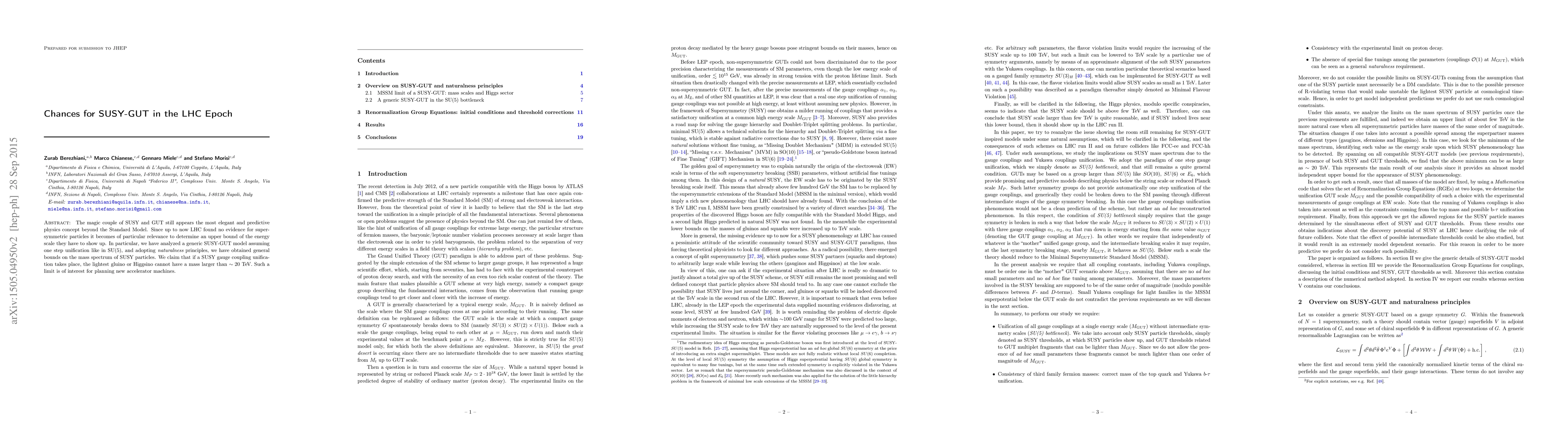This paper explores the viability of SUSY-GUT models in the context of the LHC's findings, determining an upper bound for the mass of supersymmetric particles. The analysis suggests that if SUSY gauge coupling unification occurs, the lightest gluino or Higgsino should not exceed a mass of around 20 TeV, providing crucial information for future accelerator designs.