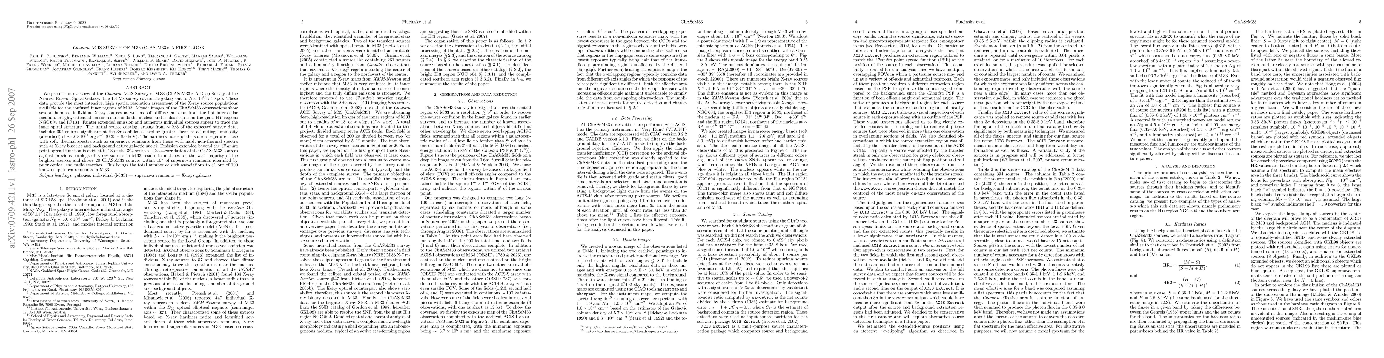 The Chandra ACIS Survey of M33 (ChASeM33) provides a deep, high-resolution X-ray survey of the nearby spiral galaxy M33, revealing hundreds of X-ray sources and diffuse emission. The initial catalog includes 394 significant sources, distinguishing thermal and non-thermal spectra, and correlates well with previous supernova remnant catalogs.