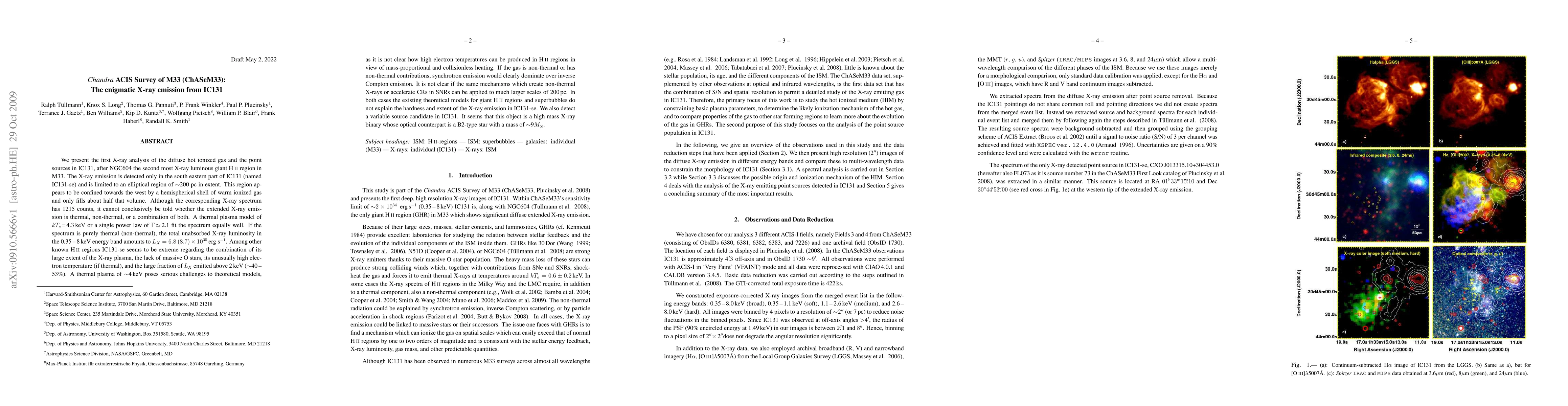 We present the first X-ray analysis of the diffuse hot ionized gas and the point sources in IC131, after NGC604 the second most X-ray luminous giant HII region in M33. The X-ray emission is detected only in the south eastern part of IC131 (named IC131-se) and is limited to an elliptical region of ~200pc in extent. This region appears to be confined towards the west by a hemispherical shell of warm ionized gas and only fills about half that volume. Although the corresponding X-ray spectrum has 1215 counts, it cannot conclusively be told whether the extended X-ray emission is thermal, non-thermal, or a combination of both. A thermal plasma model of kT_e=4.3keV or a single power law of Gamma=2.1 fit the spectrum equally well. If the spectrum is purely thermal (non-thermal), the total unabsorbed X-ray luminosity in the 0.35-8keV energy band amounts to L_X = 6.8(8.7)x10^35erg/s. Among other known HII regions IC131-se seems to be extreme regarding the combination of its large extent of the X-ray plasma, the lack of massive O stars, its unusually high electron temperature (if thermal), and the large fraction of L_X emitted above 2keV (~40-53%). A thermal plasma of ~4keV poses serious challenges to theoretical models, as it is not clear how high electron temperatures can be produced in HII regions in view of mass-proportional and collisionless heating. If the gas is non-thermal or has non-thermal contributions, synchrotron emission would clearly dominate over inverse Compton emission. It is not clear if the same mechanisms which create non-thermal X-rays or accelerate CRs in SNRs can be applied to much larger scales of 200pc. In both cases the existing theoretical models for giant HII regions and superbubbles do not explain the hardness and extent of the X-ray emission in IC131-se.