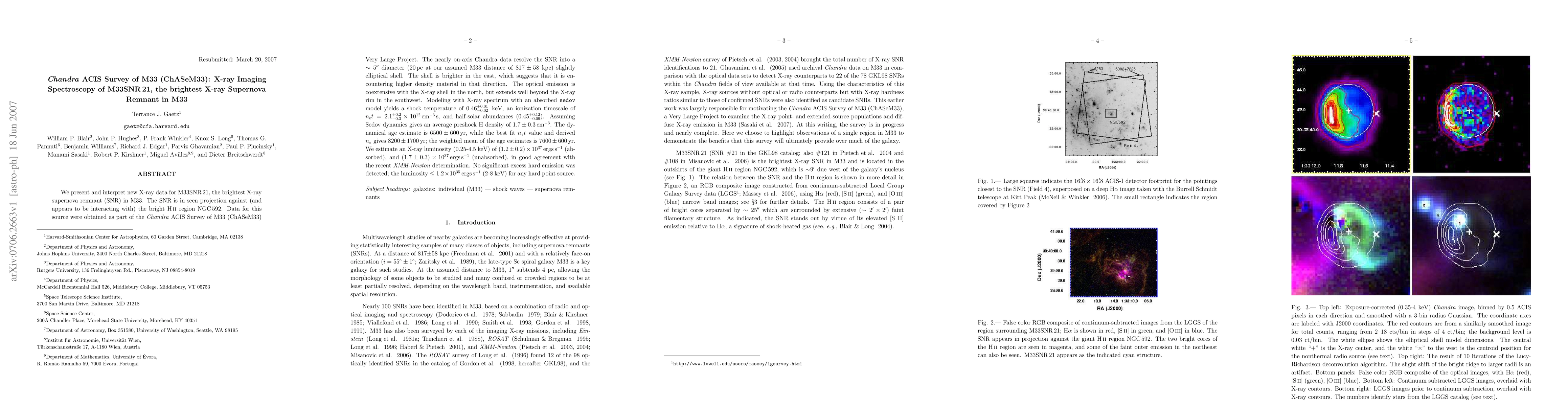 This paper presents new Chandra ACIS Survey data for M33SNR21, the brightest X-ray supernova remnant in M33, revealing a ~5" elliptical shell interacting with the HII region NGC592. The analysis suggests an estimated age of 7600 ± 600 years and an X-ray luminosity of (1.2 ± 0.2) × 10^37 ergs s^-1.