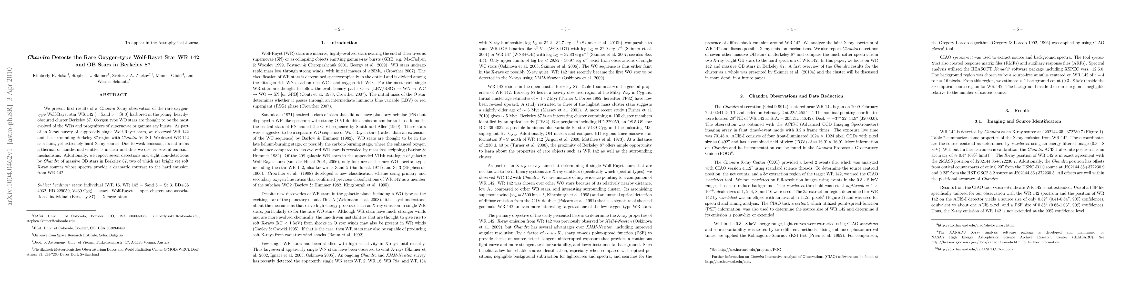 Chandra X-ray observation detects the rare oxygen-type Wolf-Rayet star WR 142 as a faint, hard X-ray source in the cluster Berkeley 87, with its emission mechanism unclear. Additionally, the survey identifies seven OB stars, two of which emit bright, soft X-rays, contrasting with WR 142's hard emission.