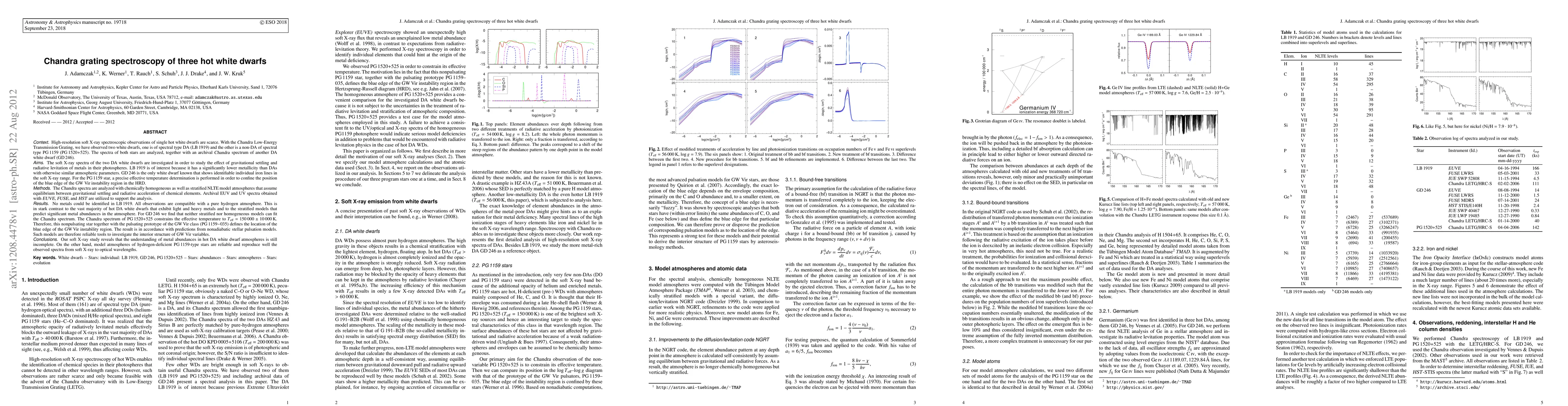 This paper uses Chandra grating spectroscopy to analyze the soft X-ray spectra of three hot white dwarfs, focusing on gravitational settling and radiative levitation effects in DA white dwarfs and the precise temperature determination for a PG1159 star to map the GW Vir instability region. LB 1919's low metallicity and GD 246's unique iron lines are particularly noteworthy.