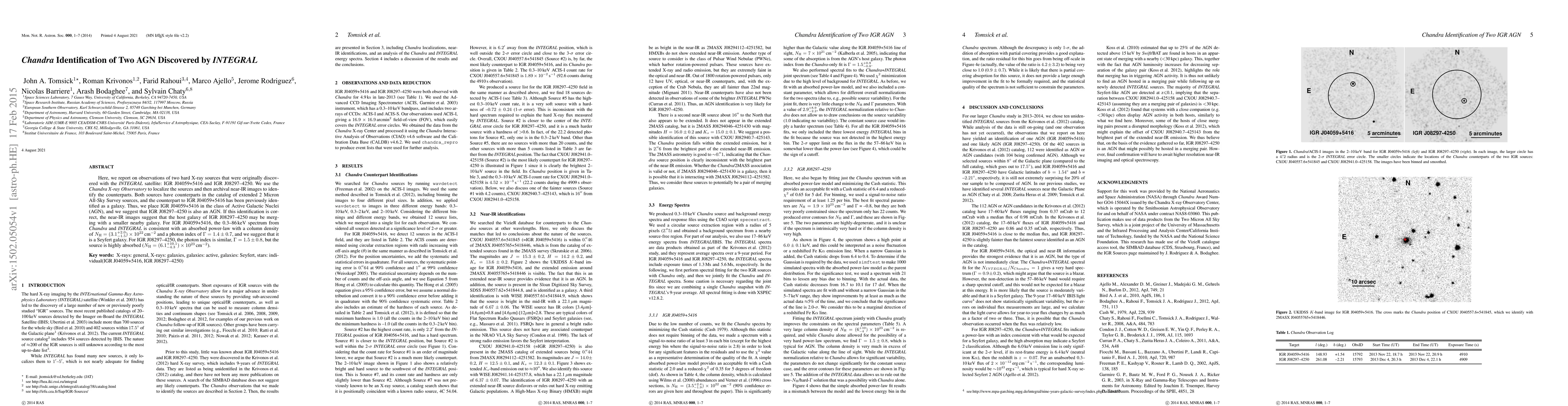 Here, we report on observations of two hard X-ray sources that were originally discovered with the INTEGRAL satellite: IGR J04059+5416 and IGR J08297-4250. We use the Chandra X-ray Observatory to localize the sources and then archival near-IR images to identify the counterparts. Both sources have counterparts in the catalog of extended 2 Micron All-Sky Survey sources, and the counterpart to IGR J04059+5416 has been previously identified as a galaxy. Thus, we place IGR J04059+5416 in the class of Active Galactic Nuclei (AGN), and we suggest that IGR J08297-4250 is also an AGN. If this identification is correct, the near-IR images suggest that the host galaxy of IGR J08297-4250 may be merging with a smaller nearby galaxy. For IGR J04059+5416, the 0.3-86 keV spectrum from Chandra and INTEGRAL is consistent with an absorbed power-law with a column density of N_H = 3.1(+2.0)(-1.5)e22 cm-2 and a photon index of Gamma = 1.4+/-0.7, and we suggest that it is a Seyfert galaxy. For IGR J08297-4250, the photon index is similar, Gamma = 1.5+/-0.8, but the source is highly absorbed (N_H = 6.1(+10.1)(-4.3)e23 cm-2).