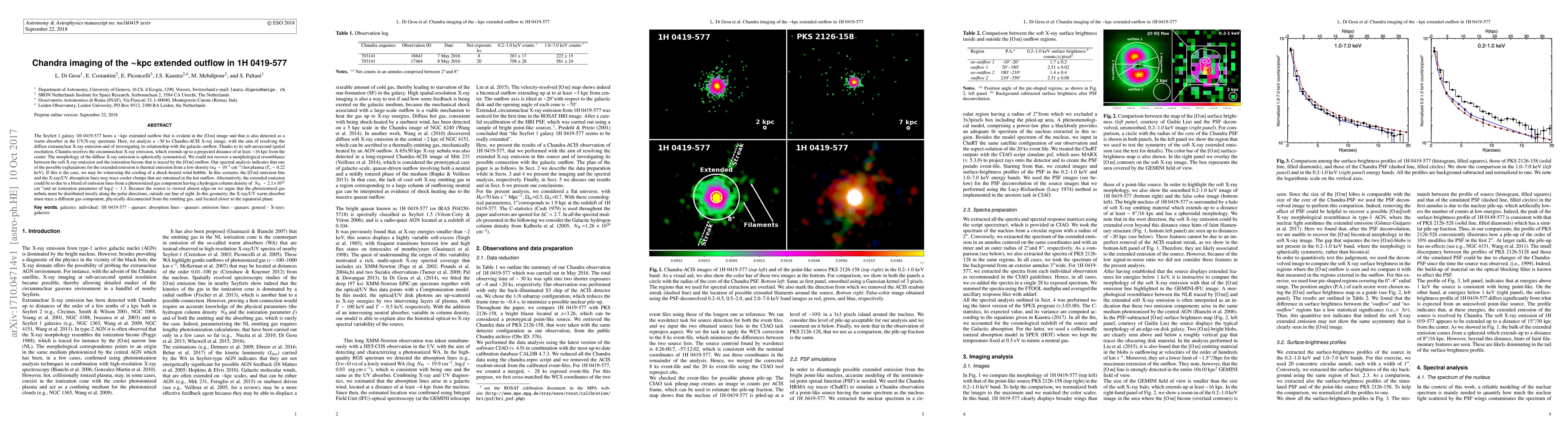 This paper uses Chandra imaging to analyze the $\sim$kpc extended outflow in the Seyfert 1 galaxy 1H 0419-577, finding a spherically symmetrical diffuse X-ray emission extending up to 16 kpc. The study concludes that the X-ray emission does not match the [\ion{O}{iii}] outflow, suggesting the ionized gas is mainly along the polar directions, while the X-ray/UV warm absorber traces a different, equatorial gas component.