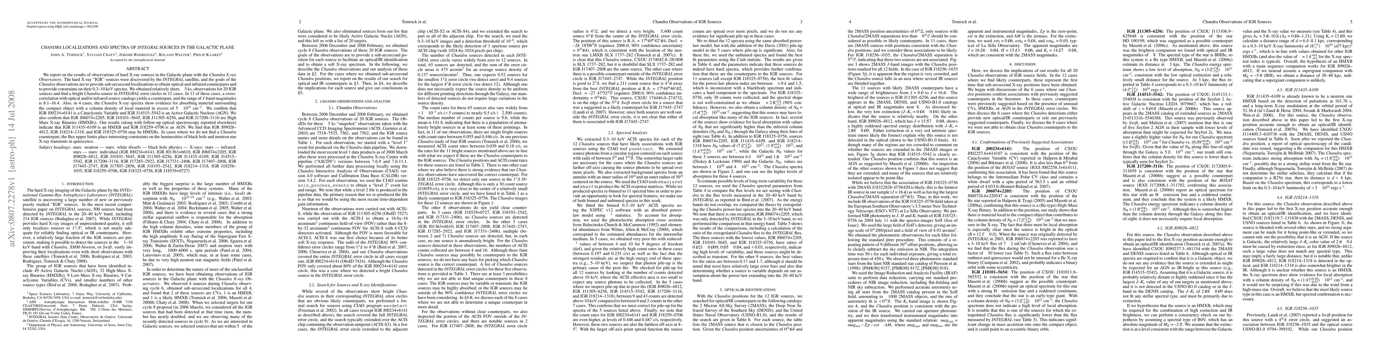 This study uses Chandra X-ray Observatory data to localize and analyze hard X-ray sources initially detected by the INTEGRAL satellite in the Galactic plane. The findings include identification of optical and infrared counterparts for 11 sources, spectral evidence of absorbing material in 4 cases, and classification of several sources as Cataclysmic Variables, Active Galactic Nuclei, and High Mass X-ray Binaries.