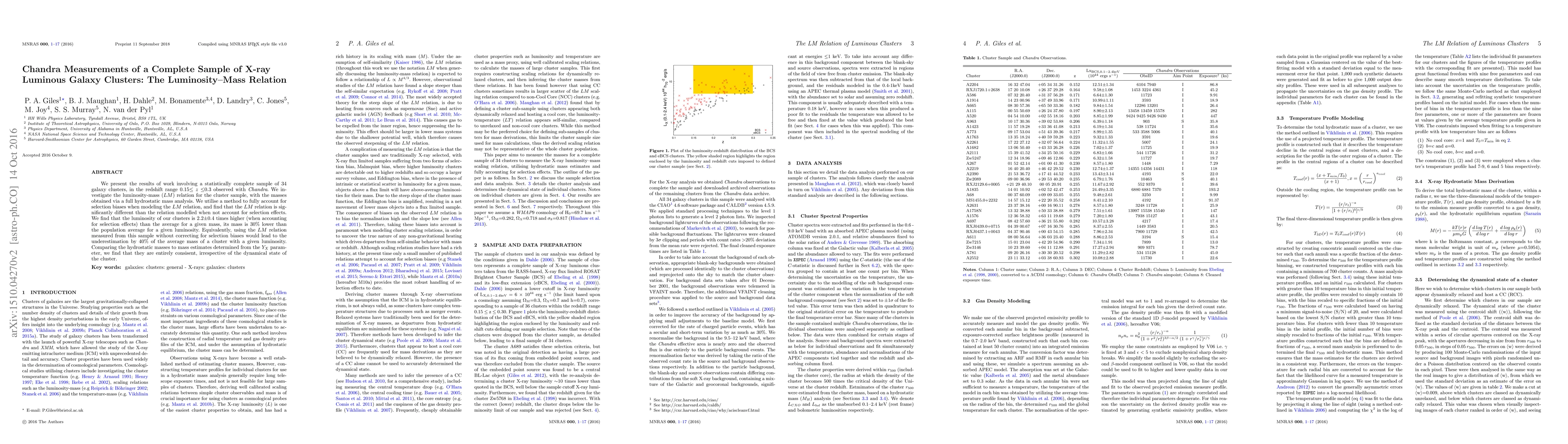 We present the results of work involving a statistically complete sample of 34 galaxy clusters, in the redshift range 0.15$\le$z$\le$0.3 observed with $Chandra$. We investigate the luminosity-mass ($LM$) relation for the cluster sample, with the masses obtained via a full hydrostatic mass analysis. We utilise a method to fully account for selection biases when modeling the $LM$ relation, and find that the $LM$ relation is significantly different than the relation modelled when not account for selection effects. We find that the luminosity of our clusters is 2.2$\pm$0.4 times higher (when accounting for selection effects) than the average for a given mass, its mass is 30% lower than the population average for a given luminosity. Equivalently, using the $LM$ relation measured from this sample without correcting for selection biases would lead to the underestimation by 40% of the average mass of a cluster with a given luminosity. Comparing the hydrostatic masses to mass estimates determined from the $Y_{X}$ parameter, we find that they are entirely consistent, irrespective of the dynamical state of the cluster.