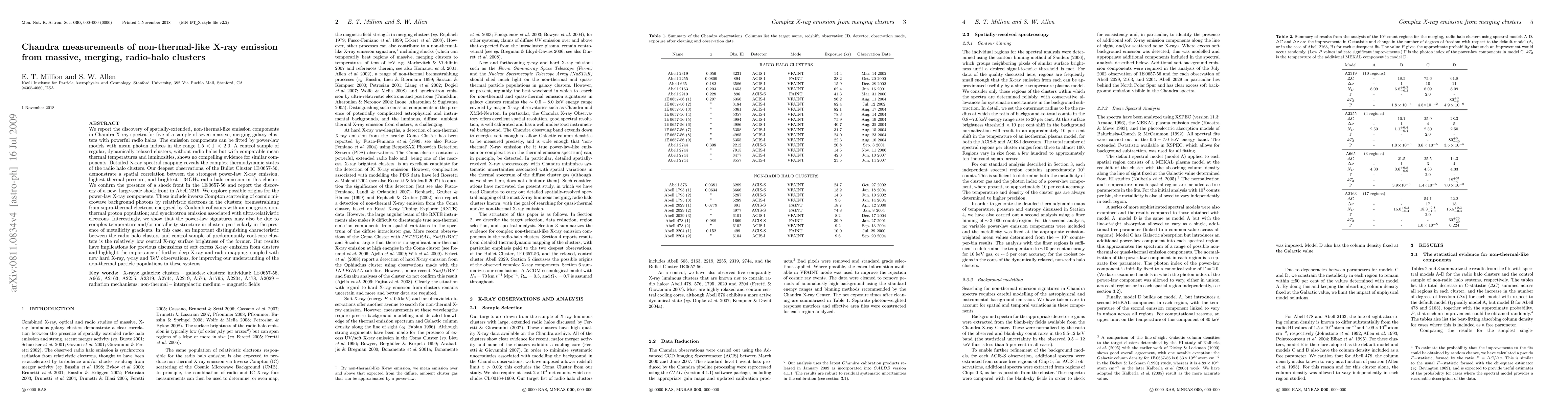 This paper reports the discovery of non-thermal-like X-ray emission in five massive, merging galaxy clusters with powerful radio halos, suggesting complex thermodynamic states and potential shock fronts. Possible origins include inverse Compton scattering, bremsstrahlung, and synchrotron emission, with complex temperature and metallicity structures also being considered.