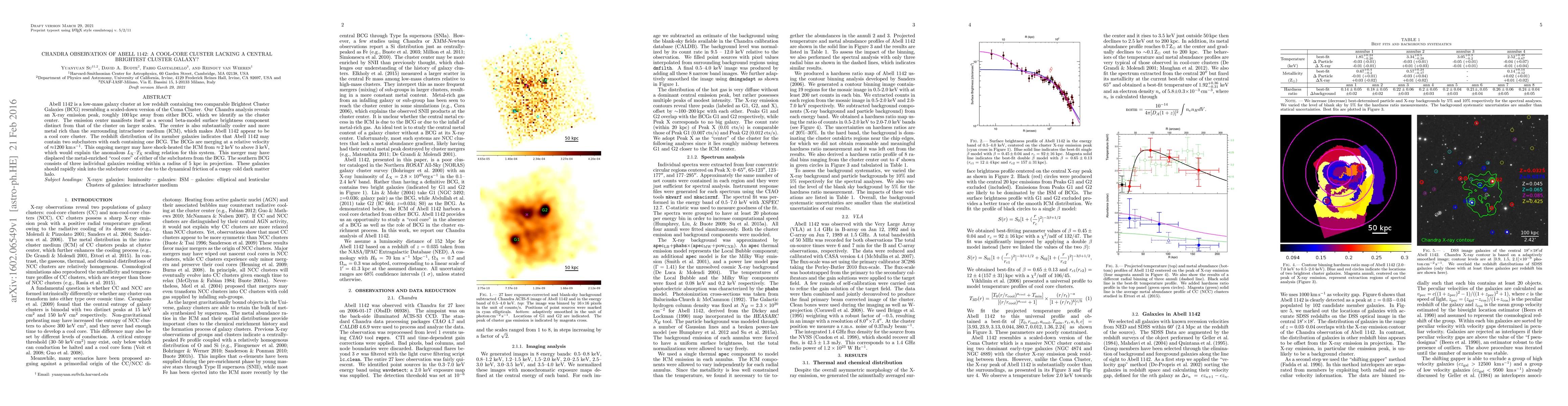 The paper presents a detailed X-ray analysis of Abell 1142, identifying a cool-core cluster lacking a central BCG due to an ongoing merger. It also discusses the implications of shock heating on the L_X--T_X scaling relation.