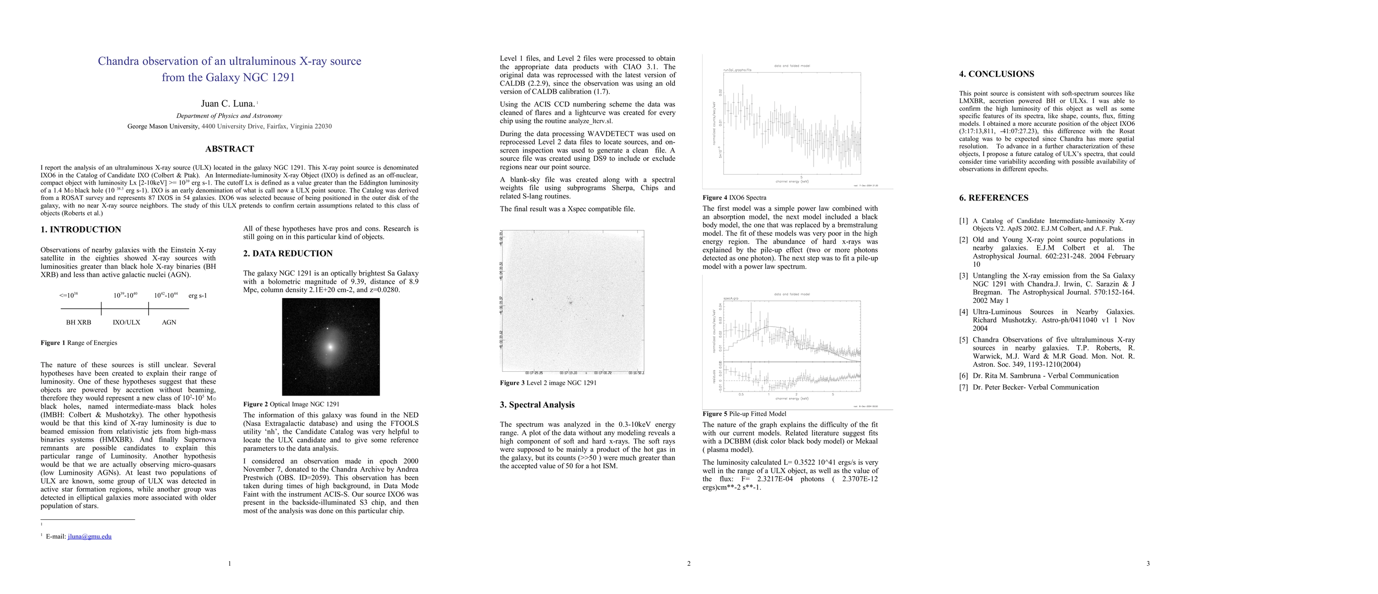 I report the analysis of an ultraluminous X-ray source (ULX) located in the galaxy NGC 1291. This X-ray point source is denominated IXO6 in the Catalog of Candidate IXO (Colbert & Ptak). An Intermediate-luminosity X-ray Object (IXO) is defined as an off-nuclear, compact object with luminosity Lx [2-10keV] >= 1039 erg s-1. The cutoff Lx is defined as a value greater than the Eddington luminosity of a 1.4 Mo black hole (10 38.3 erg s-1). IXO is an early denomination of what is call now a ULX point source. The Catalog was derived from a ROSAT survey and represents 87 IXOS in 54 galaxies. IXO6 was selected because of being positioned in the outer disk of the galaxy, with no near X-ray source neighbors. The study of this ULX pretends to confirm certain assumptions related to this class of objects (Roberts et al.)