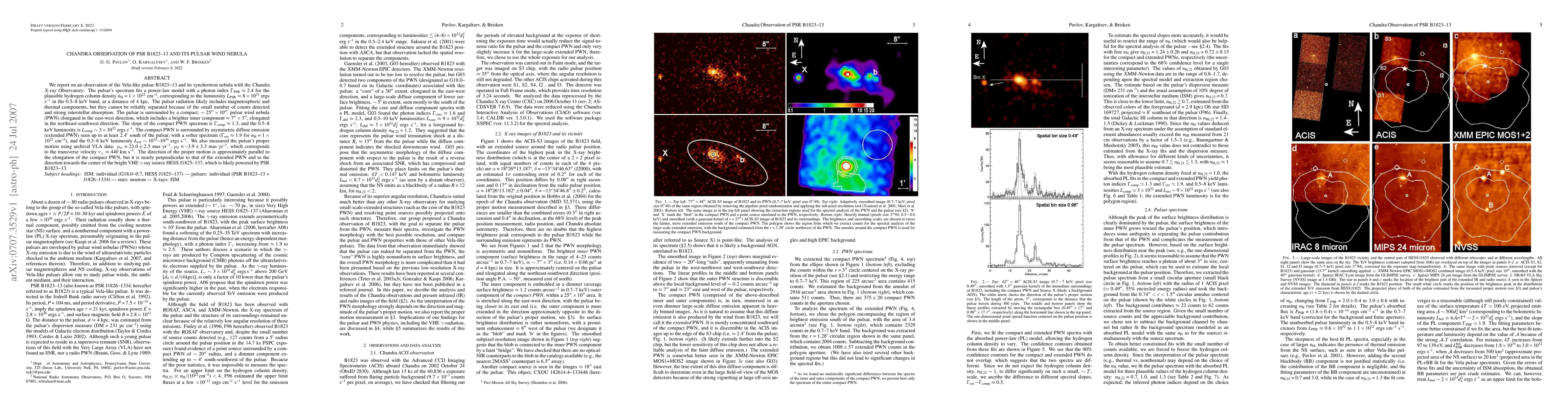 We report on an observation of the Vela-like pulsar B1823-13 and its synchrotron nebula with Chandra.The pulsar's spectrum fits a power-law model with a photon index Gamma_PSR=2.4 for the plausible hydrogen column density n_H=10^{22} cm^{-2}, corresponding to the luminosity L_PSR=8*10^{31} ergs s^{-1} in the 0.5-8 keV band, at a distance of 4 kpc. The pulsar radiation likely includes magnetospheric and thermal components, but they cannot be reliably separated because of the small number of counts detected and strong interstellar absorption. The pulsar is surrounded by a compact, 25''x 10'', pulsar wind nebula (PWN) elongated in the east-west direction, which includes a brighter inner component, 7''x 3'', elongated in the northeast-southwest direction. The slope of the compact PWN spectrum is Gamma_comp=1.3, and the 0.5-8 keV luminosity is L_comp~3*10^{32} ergs s^{-1}. The compact PWN is surrounded by asymmetric diffuse emission (extended PWN) seen up to at least 2.4' south of the pulsar, with a softer spectrum (Gamma_ext=1.9), and the 0.5-8 keV luminosity L_ext~10^{33}-10^{34} ergs s^{-1}. We also measured the pulsar's proper motion using archival VLA data: \mu_\alpha=23.0+/-2.5 mas yr^{-1}, \mu_\delta=-3.9+/-3.3 mas yr^{-1}, which corresponds to the transverse velocity v_perp=440 km s^{-1}. The direction of the proper motion is approximately parallel to the elongation of the compact PWN, but it is nearly perpendicular to that of the extended PWN and to the direction towards the center of the bright VHE gamma-ray source HESS J1825-137, which is likely powered by PSR B1823-13.