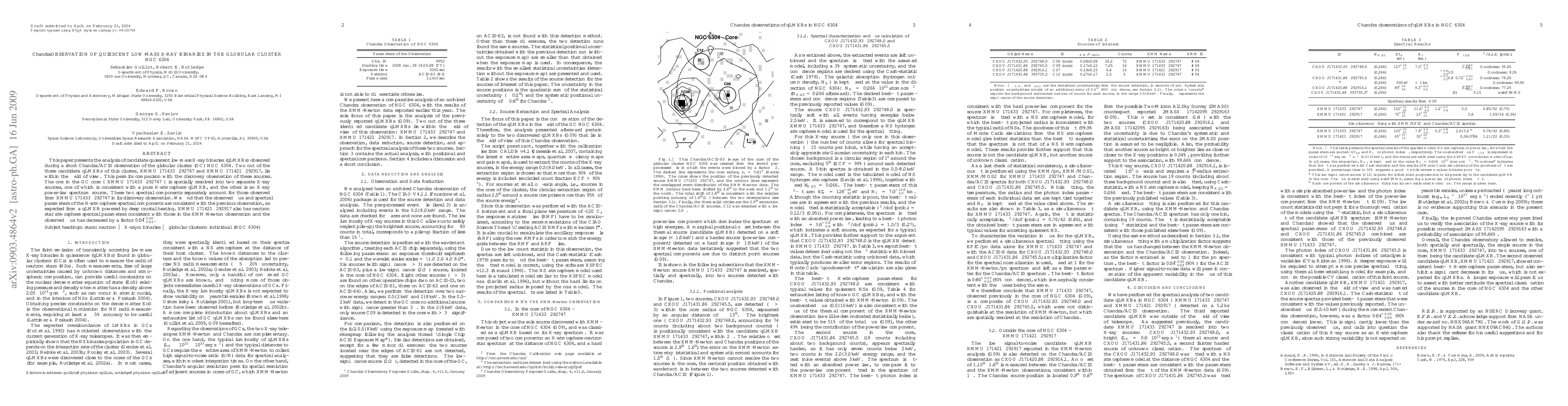 This paper presents the analysis of candidate quiescent low mass xray binarie (qLMXBs) observed during a short Chandra/ACIS observation of the globular cluster (GC) NGC 6304. Two out of the three candidate qLMXBs of this cluster, XMMU 171433-292747 and XMMU 171421-292917, lie within the field of view. This permits comparison with the discovery observation of these sources. The one in the GC core -- XMMU 171433-292747 -- is spatially resolved into two separate X-ray sources, one of which is consistent with a pure H-atmosphere qLMXB, and the other is an X-ray power-law spectrum source. These two spectral components separately account for those observed from XMMU 171433-292747 in its discovery observation. We find that the observed flux and spectral parameters of the H-atmosphere spectral components are consistent with the previous observation, as expected from a qLMXB powered by deep crustal heating. XMMU 171421-292917 also has neutron star atmosphere spectral parameters consistent with those in the XMM-Newton observation and the observed flux has decreased by a factor 0.54^{+0.30}_{-0.24}.