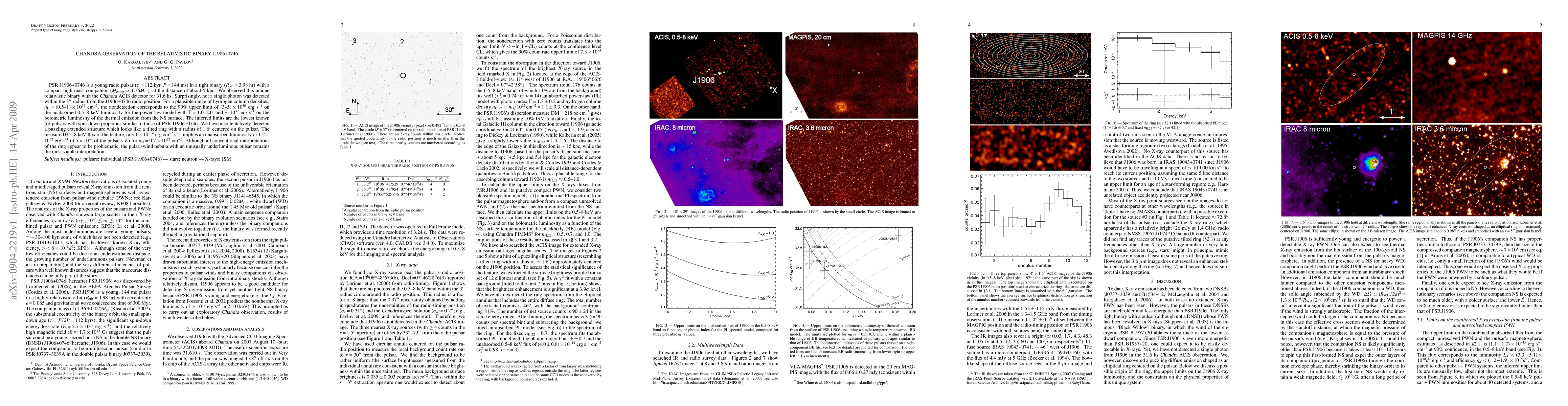 PSR J1906+0746 is a 112-kyr-old radio pulsar in a tight relativistic binary with a compact high-mass companion, at the distance of about 5 kpc. We observed this unique system with the Chandra ACIS detector for 31.6 ks. Surprisingly, not a single photon was detected within the 3" radius from the J1906+0746 radio position. For a plausible range of hydrogen column densities, n_H=(0.5-1)\times10^{22} cm^{-2}, the nondetection corresponds to the 90% upper limit of (3-5)\times10^{30} erg s^{-1} on the unabsorbed 0.5-8 keV luminosity for the power-law model with Gamma=1.0-2.0, and ~10^{32} erg s^{-1} on the bolometric luminosity of the thermal emission from the NS surface. The inferred limits are the lowest known for pulsars with spin-down properties similar to those of PSR J1906+0746. We have also tentatively detected a puzzling extended structure which looks like a tilted ring with a radius of 1.6' centered on the pulsar. The measured 0.5-8 keV flux of the feature, 3.1\times10^{-14} erg cm^{-2} s^{-1}, implies an unabsorbed luminosity of 1.2\times10^{32} erg s^{-1} (4.5\times10^{-4} of the pulsar's spin-down power). Although all conventional interpretations of the ring appear to be problematic, the pulsar-wind nebula with an unusually underluminous pulsar remains the most viable interpretation.