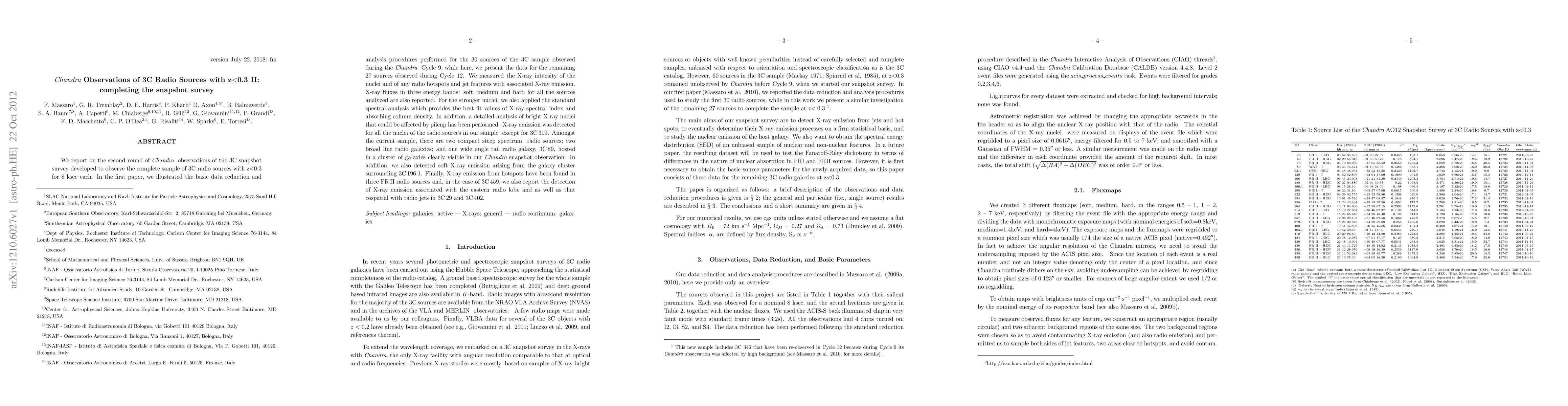 We report on the second round of Chandra observations of the 3C snapshot survey developed to observe the complete sample of 3C radio sources with z<0.3 for 8 ksec each. In the first paper, we illustrated the basic data reduction and analysis procedures performed for the 30 sources of the 3C sample observed during the Chandra Cycle 9, while here, we present the data for the remaining 27 sources observed during Cycle 12. We measured the X-ray intensity of the nuclei and of any radio hotspots and jet features with associated X-ray emission. X-ray fluxes in three energy bands: soft, medium and hard for all the sources analyzed are also reported. For the stronger nuclei, we also applied the standard spectral analysis which provides the best fit values of X-ray spectral index and absorbing column density. In addition, a detailed analysis of bright X-ray nuclei that could be affected by pileup has been performed. X-ray emission was detected for all the nuclei of the radio sources in our sample except for 3C 319. Amongst the current sample, there are two compact steep spectrum radio sources; two broad line radio galaxies; and one wide angle tail radio galaxy, 3C 89, hosted in a cluster of galaxies clearly visible in our Chandra snapshot observation. In addition, we also detected soft X-ray emission arising from the galaxy cluster surrounding 3C 196.1. Finally, X-ray emission from hotspots have been found in three FR II radio sources and, in the case of 3C 459, we also report the detection of X-ray emission associated with the eastern radio lobe and as well as that cospatial with radio jets in 3C 29 and 3C 402.