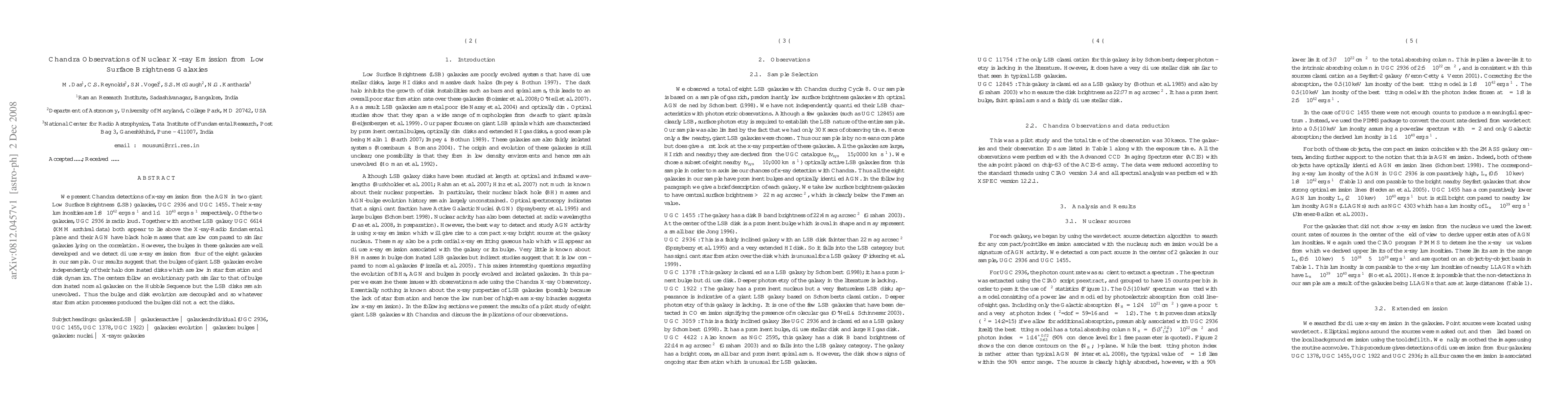 We present Chandra detections of x-ray emission from the AGN in two giant Low Surface Brightness (LSB) galaxies, UGC 2936 and UGC 1455. Their x-ray luminosities are 1.8\times10^{42} ergs/s and 1.1\times10^{40} ergs/s respectively. Of the two galaxies, UGC 2936 is radio loud. Together with another LSB galaxy UGC 6614 (XMM archival data) both appear to lie above the X-ray-Radio fundamental plane and their AGN have black hole masses that are low compared to similar galaxies lying on the correlation. However, the bulges in these galaxies are well developed and we detect diffuse x-ray emission from four of the eight galaxies in our sample. Our results suggest that the bulges of giant LSB galaxies evolve independently of their halo dominated disks which are low in star formation and disk dynamics. The centers follow an evolutionary path similar to that of bulge dominated normal galaxies on the Hubble Sequence but the LSB disks remain unevolved. Thus the bulge and disk evolution are decoupled and so whatever star formation processes produced the bulges did not affect the disks.