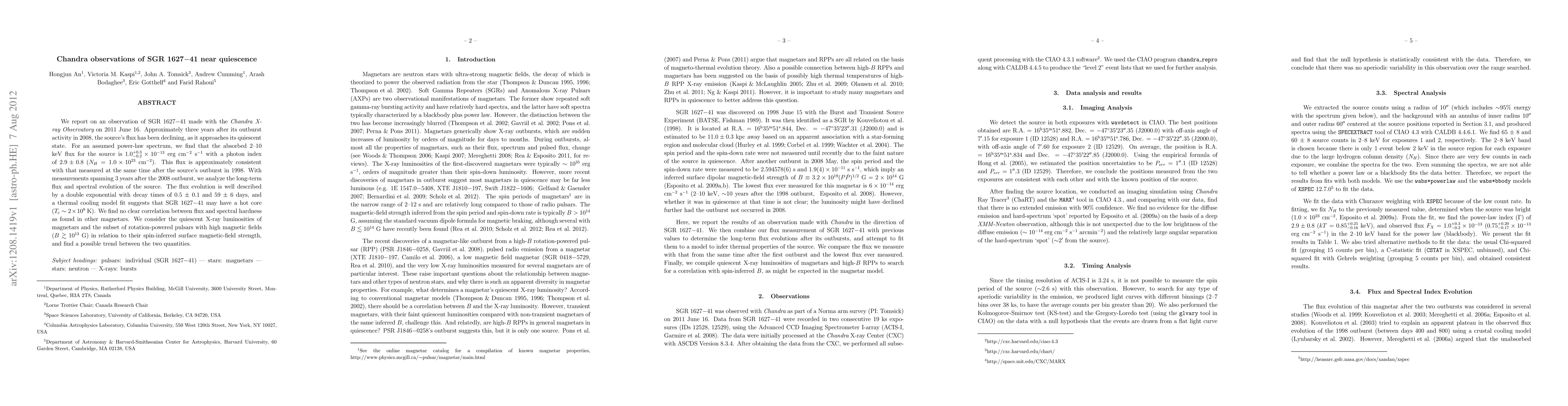 We report on an observation of SGR 1627-41 made with the Chandra X-ray Observatory on 2011 June 16. Approximately three years after its outburst activity in 2008, the source's flux has been declining, as it approaches its quiescent state. For an assumed power-law spectrum, we find that the absorbed 2--10 keV flux for the source is $1.0^{+0.3}_{-0.2} \times 10^{-13} erg cm^{-2} s^{-1}$ with a photon index of $2.9 \pm 0.8$ ($N_H=1.0\times10^{23}$ cm^{-2}). This flux is approximately consistent with that measured at the same time after the source's outburst in 1998. With measurements spanning 3 years after the 2008 outburst, we analyze the long-term flux and spectral evolution of the source. The flux evolution is well described by a double exponential with decay times of 0.5 $\pm$ 0.1 and 59 $\pm$ 6 days, and a thermal cooling model fit suggests that SGR 1627-41 may have a hot core ($T_c ~ 2\times 10^8$ K). We find no clear correlation between flux and spectral hardness as found in other magnetars. We consider the quiescent X-ray luminosities of magnetars and the subset of rotation-powered pulsars with high magnetic fields ($B >~ 10^{13}$ G) in relation to their spin-inferred surface magnetic-field strength, and find a possible trend between the two quantities.