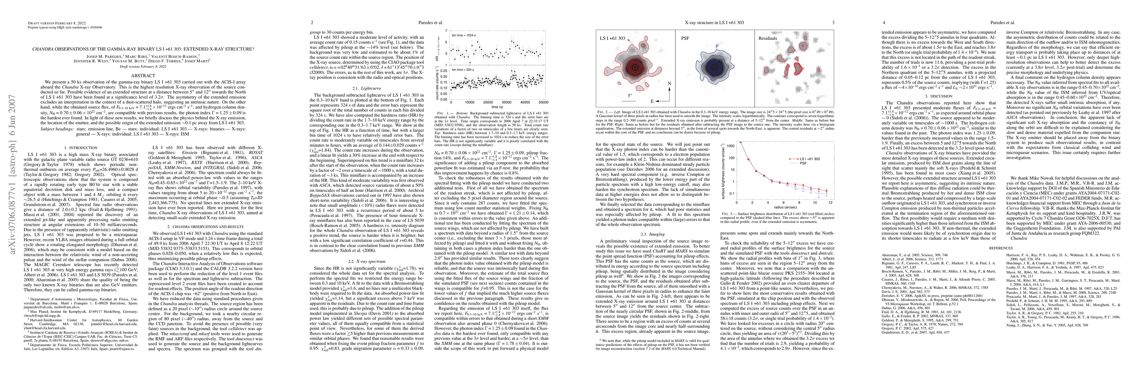 We present a 50 ks observation of the gamma-ray binary LSI+61303 carried out with the ACIS-I array aboard the Chandra X-ray Observatory. This is the highest resolution X-ray observation of the source conducted so far. Possible evidence of an extended structure at a distance between 5 and 12 arcsec towards the North of LSI+61303 have been found at a significance level of 3.2 sigma. The asymmetry of the extended emission excludes an interpretation in the context of a dust-scattered halo, suggesting an intrinsic nature. On the other hand, while the obtained source flux, of F_{0.3-10 keV}=7.1^{+1.8}_{-1.4} x 10^{-12} ergs/cm^2/s, and hydrogen column density, N_{H}=0.70+/-0.06 x 10^{22} cm^{-2}, are compatible with previous results, the photon index Gamma=1.25+/-0.09 is the hardest ever found. In light of these new results, we briefly discuss the physics behind the X-ray emission, the location of the emitter, and the possible origin of the extended emission ~0.1 pc away from LSI+61303.