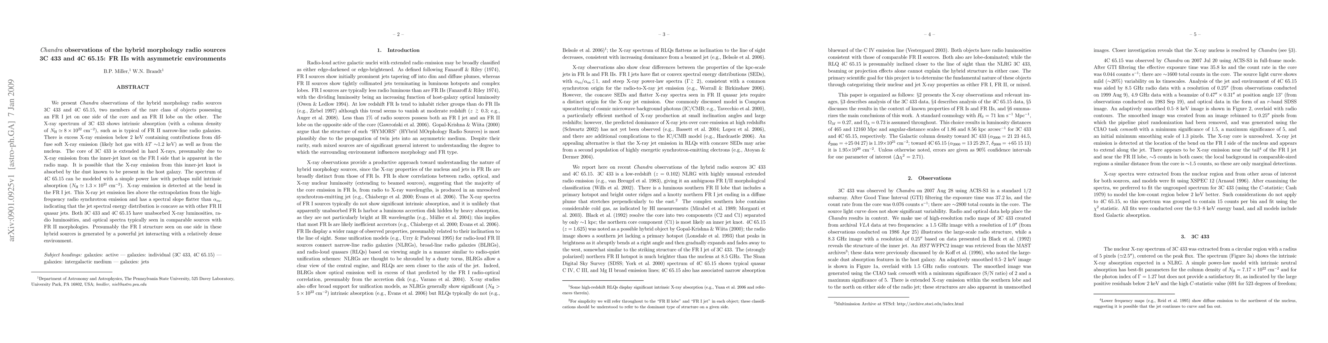 This paper uses Chandra observations to study the hybrid morphology radio sources 3C 433 and 4C 65.15, revealing their unique FR I and FR II structures. The X-ray spectra suggest different absorption levels and environments, with 3C 433 showing intrinsic absorption and excess X-ray emission, while 4C 65.15 exhibits a flatter jet spectrum indicative of a dense interaction environment.