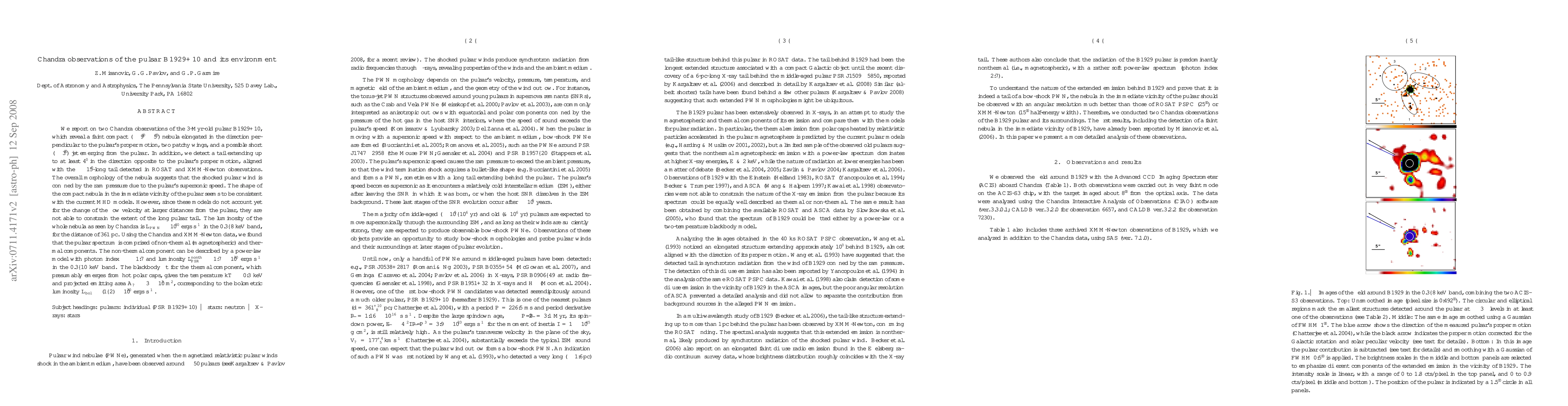 Chandra observations of the pulsar PSR B1929+10 reveal a faint, elongated nebula with wings and a possible jet, suggesting a pulsar wind confined by ram pressure. The pulsar spectrum includes non-thermal and thermal components, with the former described by a power-law model.