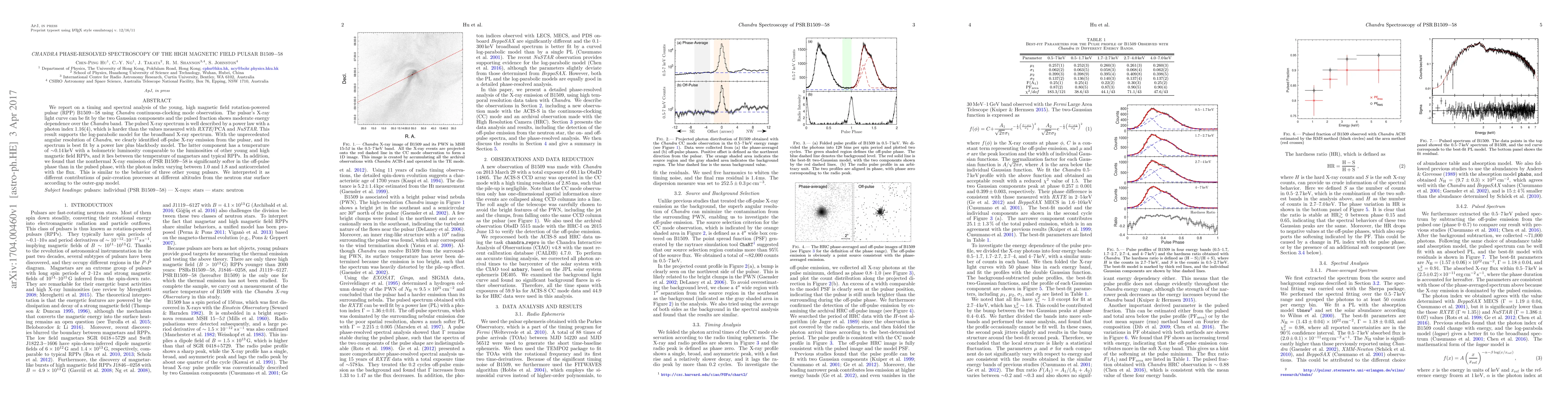 This study uses Chandra's phase-resolved spectroscopy to analyze the X-ray emissions of the high magnetic field pulsar B1509-58, revealing a pulsed fraction with moderate energy dependence and a spectrum best described by a log-parabolic model. The off-pulse emission shows a softer nonthermal component, suggesting different pair-creation processes at varying altitudes.