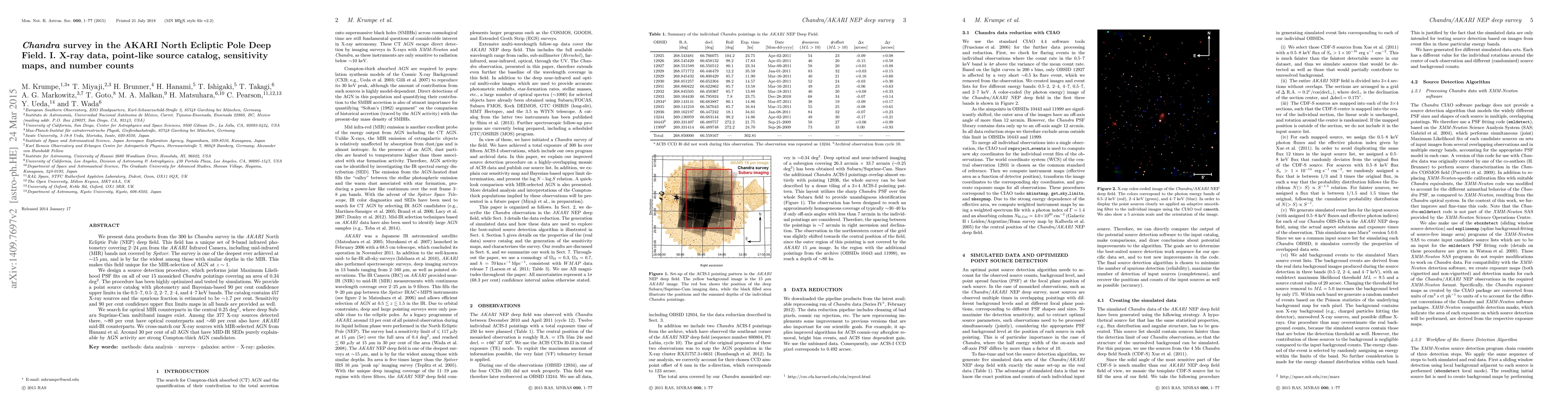 This paper presents Chandra X-ray survey data from the AKARI North Ecliptic Pole deep field, featuring a comprehensive 9-band infrared dataset. The study provides a catalog of 457 X-ray sources, sensitivity maps, and number counts, highlighting the survey's effectiveness in identifying mid-infrared selected AGN at z~1.