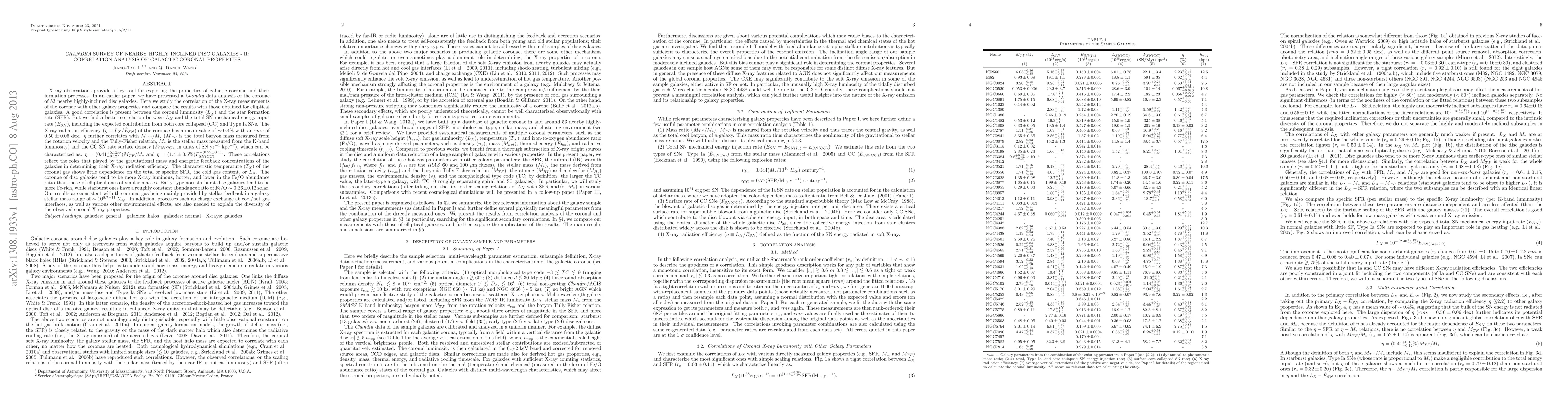 X-ray observations provide a key tool for exploring the properties of galactic coronae and their formation processes. In an earlier paper, we have presented a Chandra data analysis of the coronae of 53 nearby highly-inclined disc galaxies. Here we study the correlation of the X-ray measurements with other galaxy properties and compare the results with those obtained for elliptical galaxies. A good correlation is present between the coronal luminosity Lx and the SFR. But we find a better correlation between Lx and the total SN mechanical energy input rate (ESN), including the expected contribution from core collapsed (CC) and Ia SNe. The X-ray radiation efficiency (eta=Lx/ESN) has a mean value of ~0.4% with an rms of ~0.5dex. eta further correlates with MTF/M* (MTF is the baryon mass measured from the rotation velocity and the Tully-Fisher relation, M* is the stellar mass measured from the K-band luminosity) and the CC SN rate surface density (FSN, in units of SN/yr/kpc^2), which can be characterized as: eta=0.41%MTF/M* and eta=1.4%FSN^-0.3. These correlations reflect the roles played by the gravitational mass and energetic feedback concentrations in determining eta. The characteristic temperature of the corona shows little dependence on the total or specific SFR, the cold gas content, or Lx. The coronae of disc galaxies tend to be more X-ray luminous, hotter, and lower in Fe/O abundance ratio than those of elliptical ones of similar masses. Early-type non-starburst disc galaxies tend to be more Fe-rich, while starburst ones have a roughly constant abundance ratio of Fe/O~0.36solar. Our results are consistent with the coronal gas being mainly provided by stellar feedback in a mass range of M*~10^{8.7-11}Msun. In addition, processes such as charge exchange at cool/hot gas interfaces, as well as various environmental effects, are also needed to explain the diversity of coronal properties.