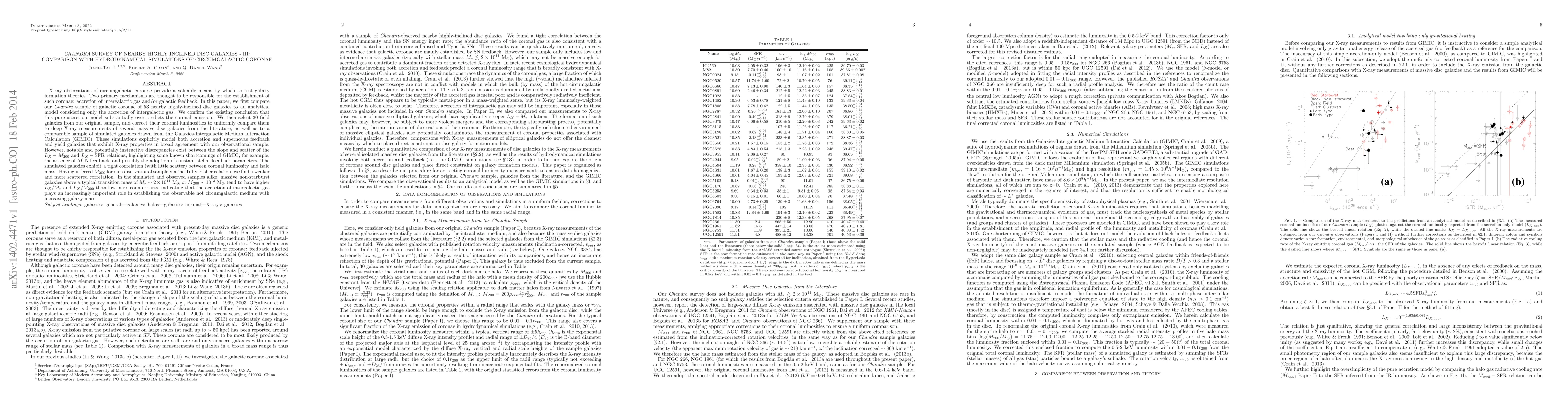 X-ray observations of circumgalactic coronae provide a valuable means by which to test galaxy formation theories. Two primary mechanisms are thought to be responsible for the establishment of such coronae: accretion of intergalactic gas (IGM) and/or galactic feedback. In this paper, we first compare our Chandra sample of galactic coronae of 53 nearby highly-inclined disc galaxies to an analytical model considering only the accretion of IGM. We confirm the existing conclusion that this pure accretion model substantially over-predicts the coronal emission. We then select 30 field galaxies from our original sample, and correct their coronal luminosities to uniformly compare them to deep X-ray measurements of several massive disc galaxies from the literature, as well as to a comparable sample of simulated galaxies drawn from the Galaxies-Intergalactic Medium Interaction Calculation (GIMIC). These simulations explicitly model both accretion and SNe feedback and yield galaxies exhibit X-ray properties in broad agreement with our observational sample. However, notable and potentially instructive discrepancies exist between the slope and scatter of the Lx-M200 and Lx-SFR relations, highlighting some known shortcomings of GIMIC, e.g., the absence of AGN feedback, and possibly the adoption of constant stellar feedback parameters. The simulated galaxies exhibit a tight Lx-M200 correlation with little scatter. Having inferred M200 for our observational sample via the Tully-Fisher relation, we find a weaker and more scattered correlation. In the simulated and observed samples alike, massive non-starburst galaxies above a typical transition mass of M*~2e11Msun or M200~1e13Msun tend to have higher Lx/M* and Lx/M200 than low-mass counterparts, indicating that the accretion of IGM plays an increasingly important role in establishing the observable hot circumgalactic medium with increasing galaxy mass.