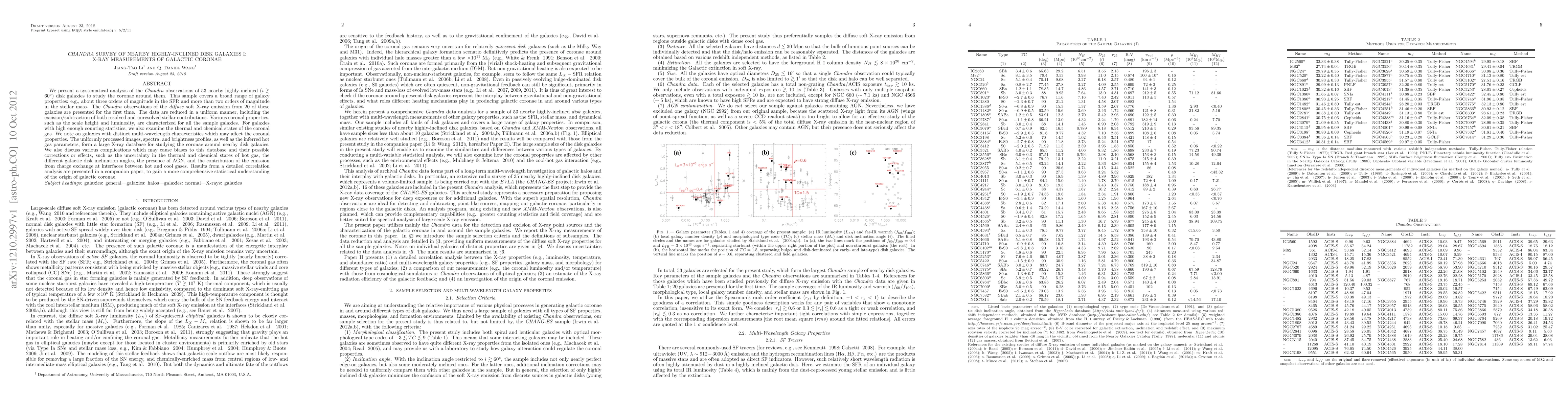 This paper systematically analyzes Chandra X-ray observations of 53 highly-inclined disk galaxies to study their coronae, characterizing properties like scale height and luminosity. The study also examines the thermal and chemical states of coronal gas, noting potential biases and complications such as AGN presence and charge exchange effects.