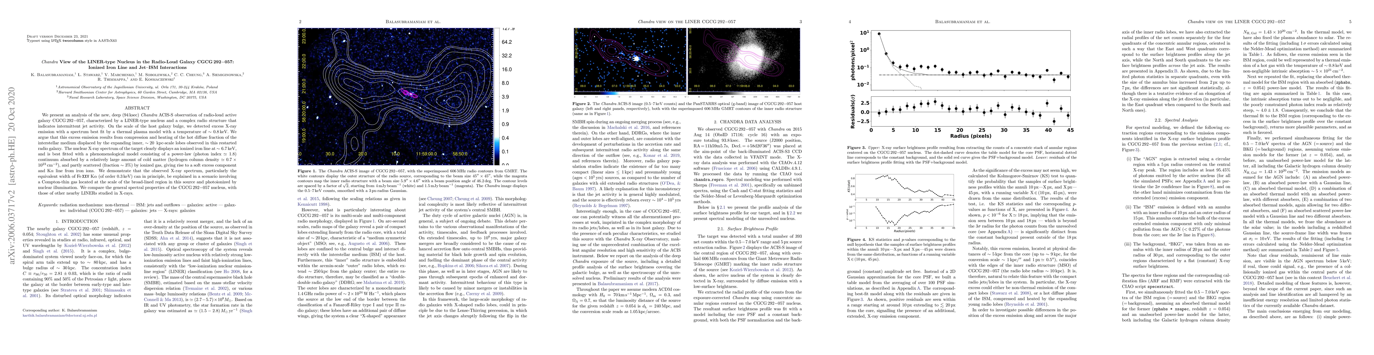 We present an analysis of the new, deep (94\,ksec) {\it Chandra} ACIS-S observation of radio-loud active galaxy CGCG\,292$-$057, characterized by a LINER-type nucleus and a complex radio structure that indicates intermittent jet activity. On the scale of the host galaxy bulge, we detected excess X-ray emission with a spectrum best fit by a thermal plasma model with a temperature of $\sim 0.8$\,keV. We argue that this excess emission results from compression and heating of the hot diffuse fraction of the interstellar medium displaced by the expanding inner, $\sim 20$\, kpc-scale lobes observed in this restarted radio galaxy. The nuclear X-ray spectrum of the target clearly displays an ionized iron line at $\sim 6.7$\,keV, and is best fitted with a phenomenological model consisting of a power-law (photon index $\simeq 1.8$) continuum absorbed by a relatively large amount of cold matter (hydrogen column density $\simeq 0.7 \times 10^{23}$\,cm$^{-2}$), and partly scattered (fraction $\sim 3\%$) by ionized gas, giving rise to a soft excess component and K$\alpha$ line from iron ions. We demonstrate that the observed X-ray spectrum, particularly the equivalent width of Fe\,\texttt{XXV} K$\alpha$ (of order $0.3$\,keV) can in principle, be explained in a scenario involving a Compton-thin gas located at the scale of the broad-lined region in this source and photoionized by nuclear illumination. We compare the general spectral properties of the CGCG\,292$-$057 nucleus, with those of other nearby LINERs studied in X-rays.